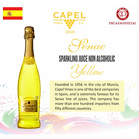 • Palate: The fresh and gentle melon aromas on the palate with a medium body accompanied by a light bubbly sensation. These goods have gas, no alcohol and a sweet taste which is good for digestion and beauty.   Giải Thưởng/ Prizes: Đang cập nhật. Nhãn Hiệu/ Brand: Senac. Xuất Xứ/ Origin: Tây Ban Nha. Vùng/ Region: Murcia. Giống Nho/ Grape Variety: Nước nho cô đặc, hương Dưa Lưới. Dung Tích/ Capacity: 750ml Nồng Độ/ ABV: 0%   Kết Hợp/ Pair Food: Thích hợp cho mọi món ăn, phù hợp với mọi thành viên trong gia đình, các sự kiện, bữa tiệc và các ngày Lễ. For every food, suitable for every member of the family, events, parties, Feast days and especially for congratulatory occasions need an exploded cap and gas foam.   Nhiệt Độ Ướp/ Ideal Temperature: 8-10°C