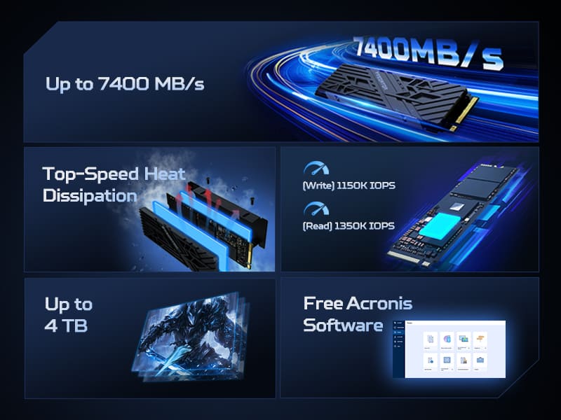 Predator GM7000 Heatsink cung cấp tốc độ đọc và ghi tuần tự lên đến 7400 MB/s để tải trò chơi siêu nhanh và truyền tệp lớn. Tốc độ đọc và ghi tuần tự cao ở tốc độ này đảm bảo chơi game mượt mà mà không bị rớt khung hình.