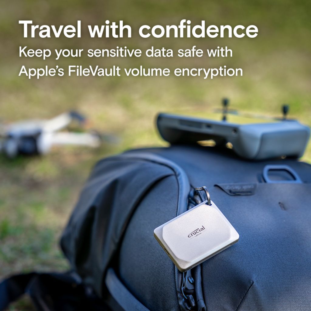 Được cải tiến bởi Micron, Crucial X9 Pro cho Mac có kiểu dáng đẹp và nhẹ với nhôm anodized và đế cảm ứng mềm cao su trong thiết kế mini 65 x 50 mm bao gồm đèn hoạt động truyền động trong lỗ dây buộc tích hợp.