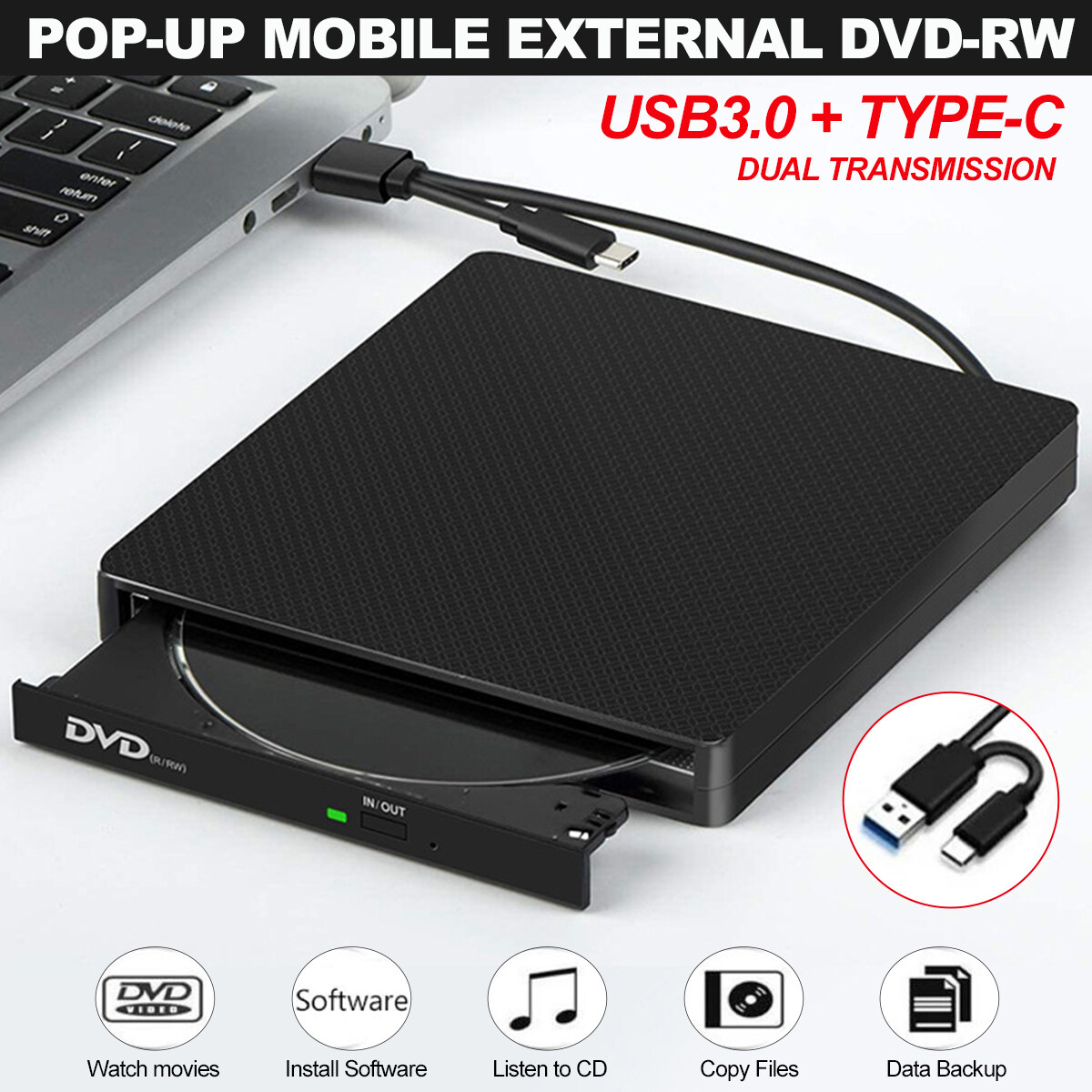 ✨Ổ đĩa CD/DVD gắn ngoài cho máy tính,xách tay,Macbook,1 USB 3.0 Type-C Đầu ghi CD/DVD di động-Hàng Chính Hãng