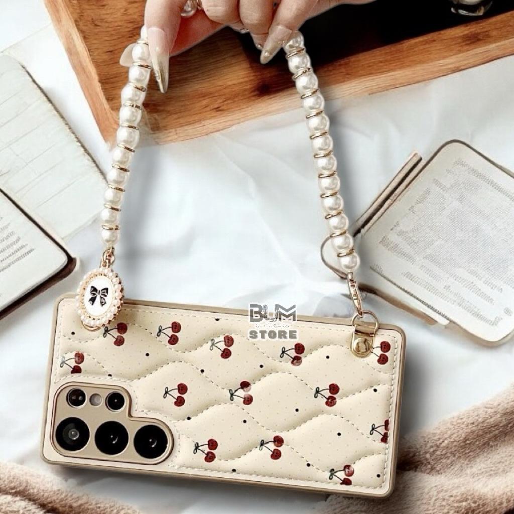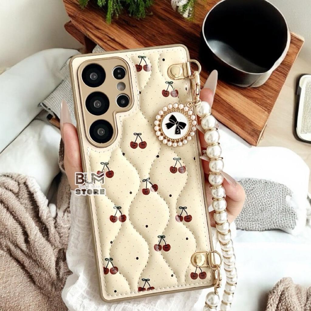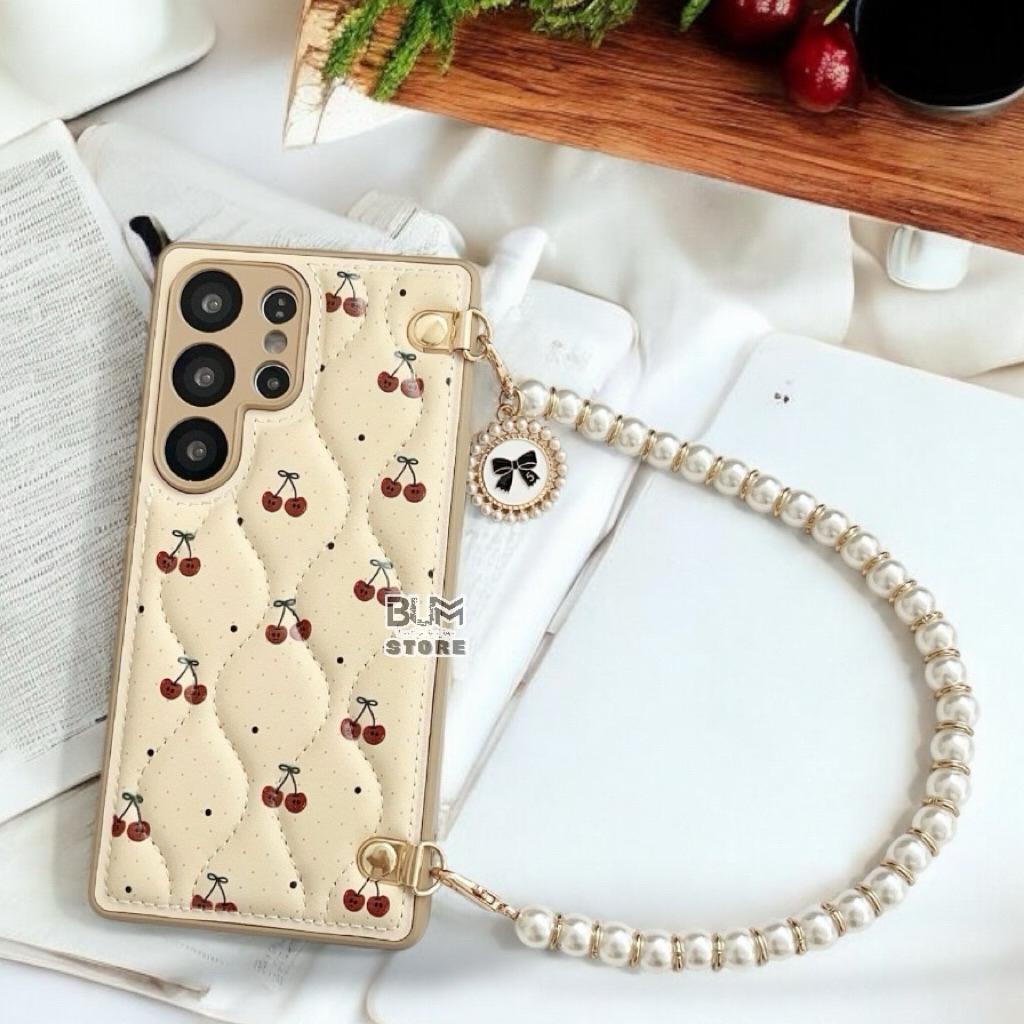 Ốp Lưng TPU Chỉ Nổi Quả Cherry Kèm Dây Ngọc Cho Samsung S25 Ultra / S25 PLus / S24 PLus / S24 Ultra / S23 Ultra Chất Liệu : Nhựa TPU dẻo dày dặn Mặt