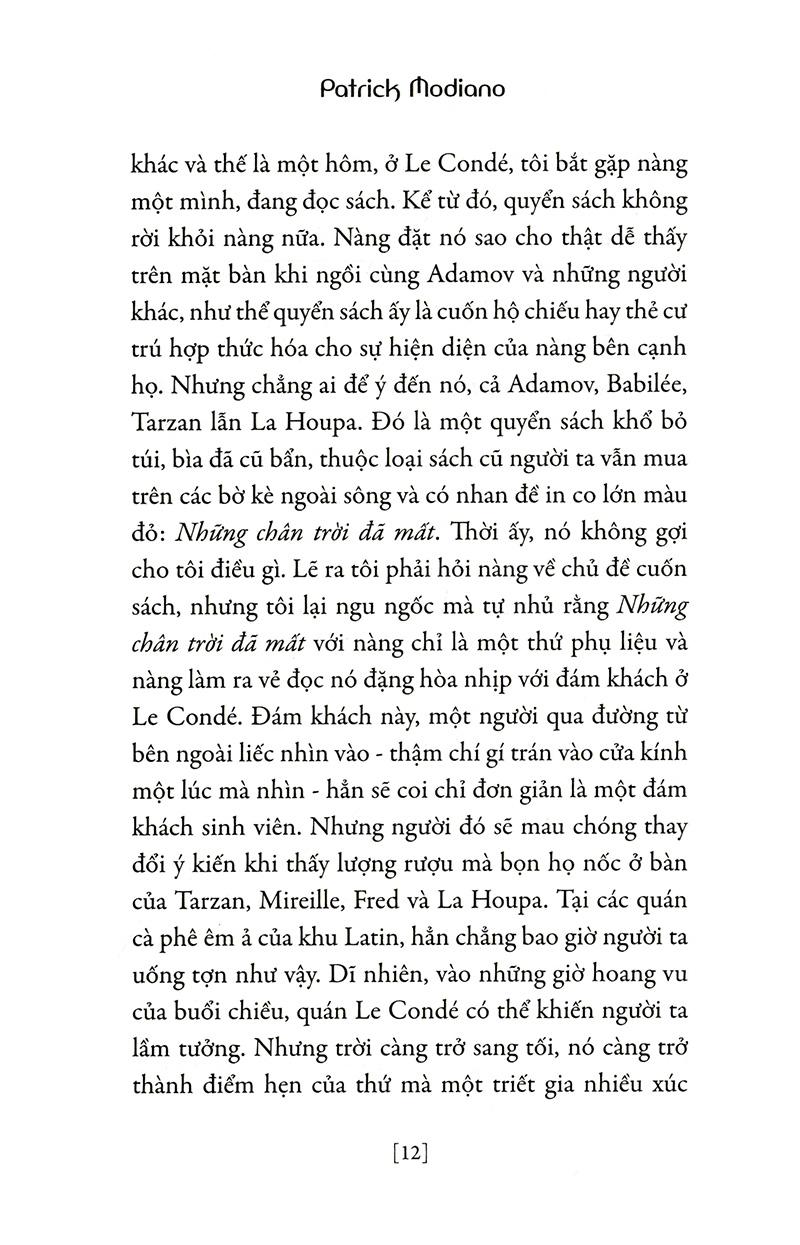 Hiếm tác giả nào khai thác di sản triết học của Guy Debord mềm mại như thế. Patrick Modiano đã biến lý tưởng "trôi dạt" của triết gia độc đáo ấy trở thành một tác phẩm cuốn hút, đặt những người có thật vào vòng hư ảo và đưa nhân vật hư ảo đến bến bờ thực tại theo một đường lối văn chương ảo diệu, ở quán cà phê của tuổi trẻ đã qua.