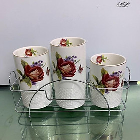 Bộ gồm 3 lọ sứ cao cấp Chất liệu: sứ cao cấp men bóng, bề mặt sần sang trọng Dùng để thìa, dĩa, đũ trên bàn ăn rất sang trọng Giá đỡ inox thuận tiện