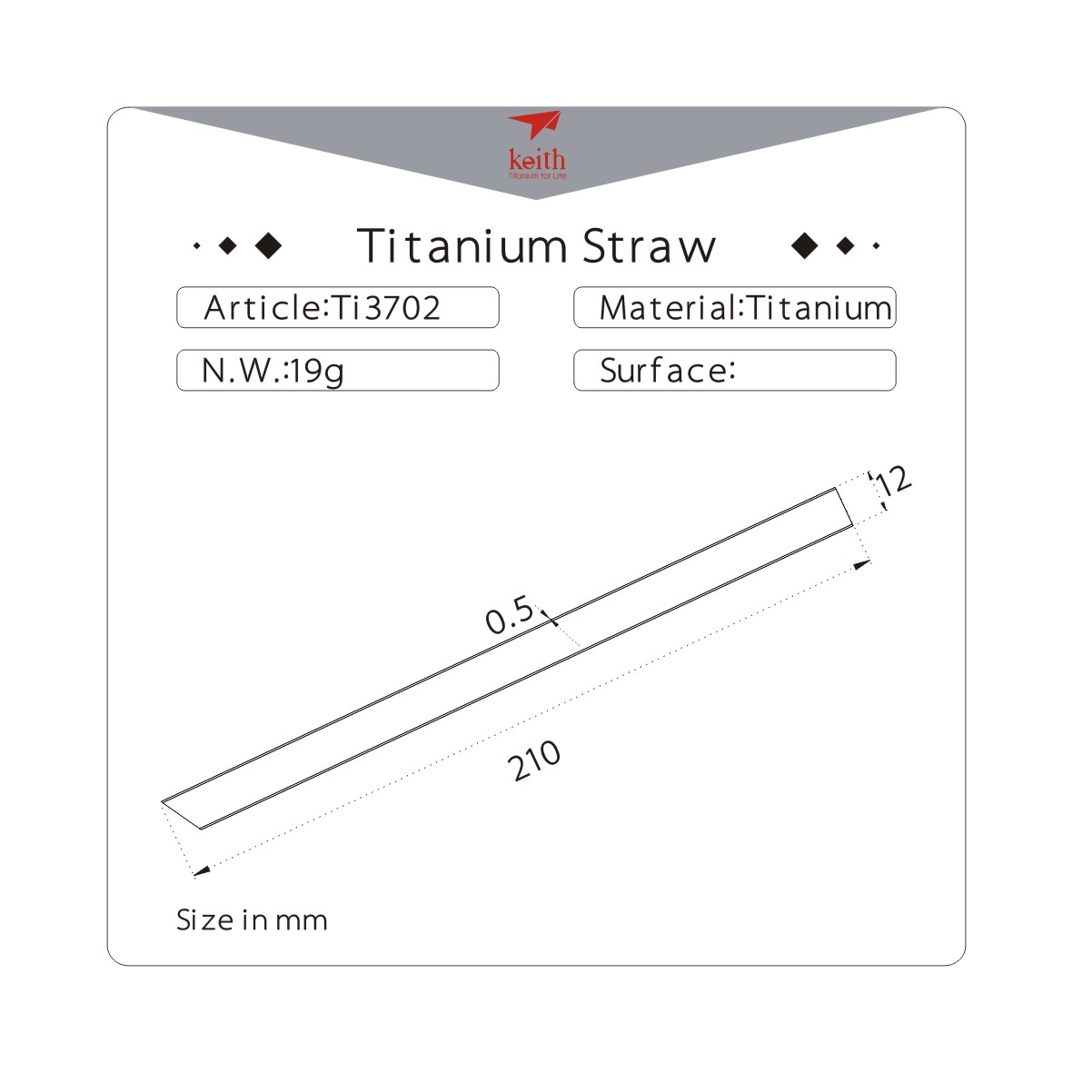 THÔNG TIN SẢN PHẨM: - Thương hiệu: Keith Titanium - Xuất xứ: Trung Quốc - Chất liệu: Titanium - Kích thước: Ø12 x 210 mm - Trọng lượng: 19 g Ống hút Keith Titanium không