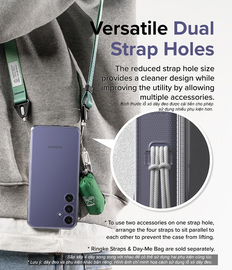 Kích thước lỗ xỏ dây đeo cải tiến cho phép treo (móc) được 2 phụ kiện cùng lúc. Lưu ý: dây đeo được bán riêng. Hình ảnh chỉ minh họa cách sử dụng sản phẩm.