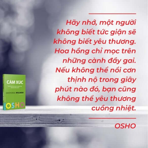 • Osho khẳng định rằng một người không biết cách tức giận sẽ không thể yêu thương thật sự. Để sống lành mạnh, chúng ta phải chấp nhận toàn bộ cảm xúc của bản thân, không đè nén hay loại bỏ chúng. Việc kìm nén cảm xúc chỉ khiến chúng ta trở nên không trọn vẹn, và chúng tiếp tục bị đẩy vào những góc khuất trong tâm trí, khiến ta cảm thấy đau đớn và thiếu thốn nội tâm. Osho khuyên rằng thay vì đè nén, ta cần học cách hòa hợp các nguồn năng lượng của mình.