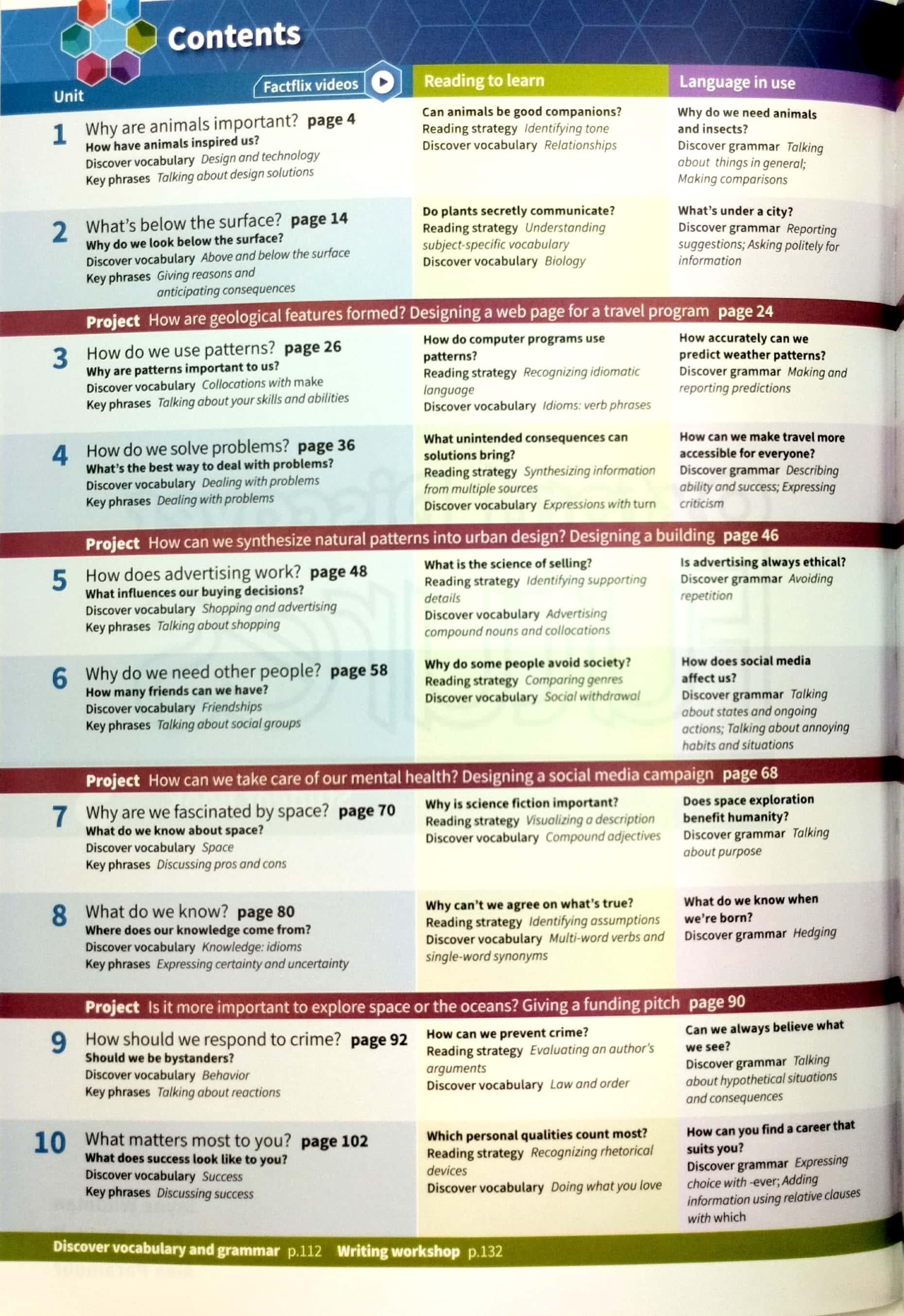 Each unit presents students with a unit question, and five lesson questions, encouraging students to examine the world more critically within an inquiry-based learning environment. The Student Book also includes Vocabulary and Grammar reference and practice, Project lessons, Literature lessons, and a Writing workshop.
