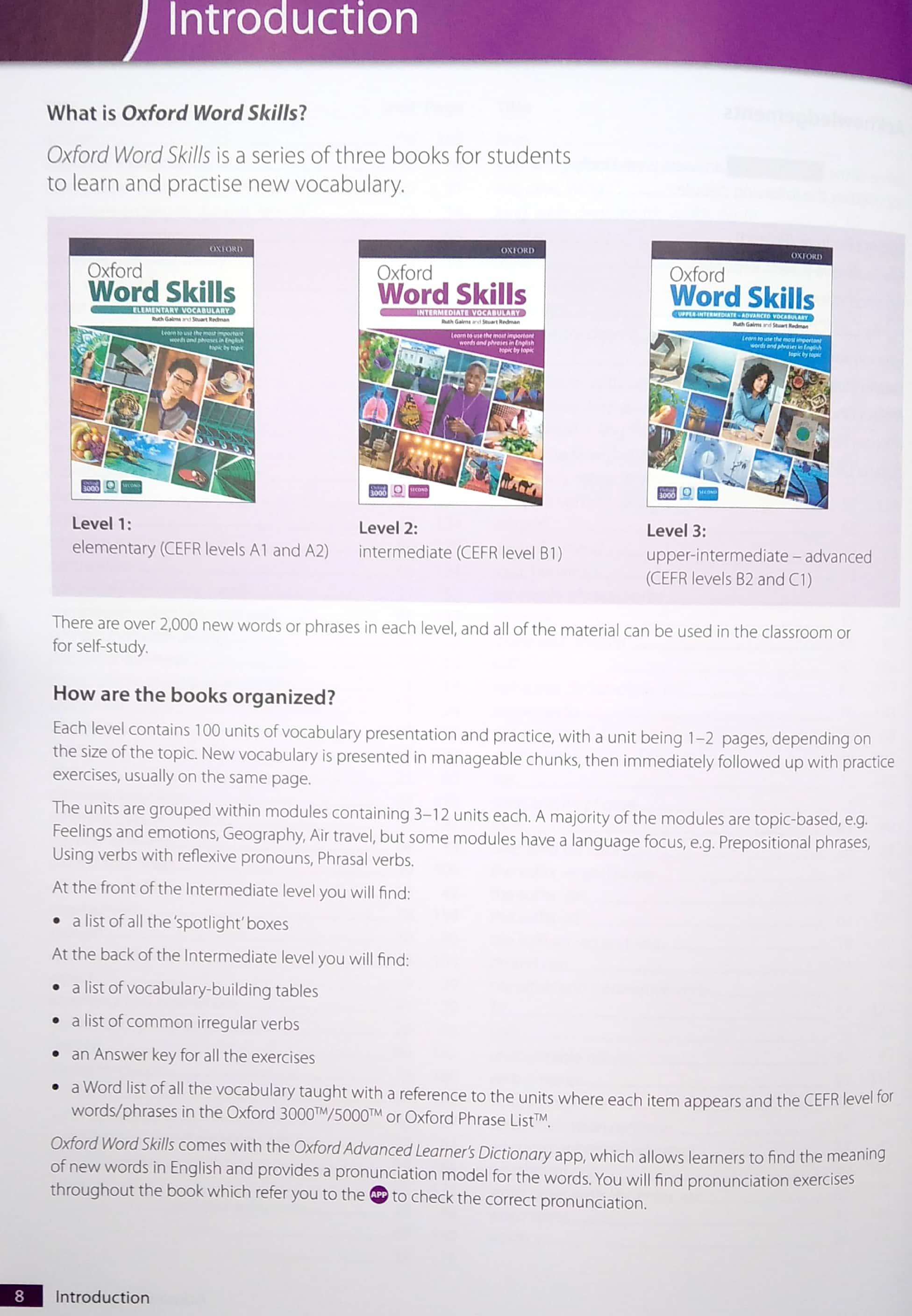 Oxford Word Skills improves students' vocabulary and vocabulary-learning skills. Short, clear presentations and lots of opportunity for practice give students the confidence to use new vocabulary. 100 units at each level mean they cover a huge range of topics and everyday situations. The Oxford Advanced Learner's Dictionary app, or OALD app, provides pronunciation and more information about the meaning and usage of words.