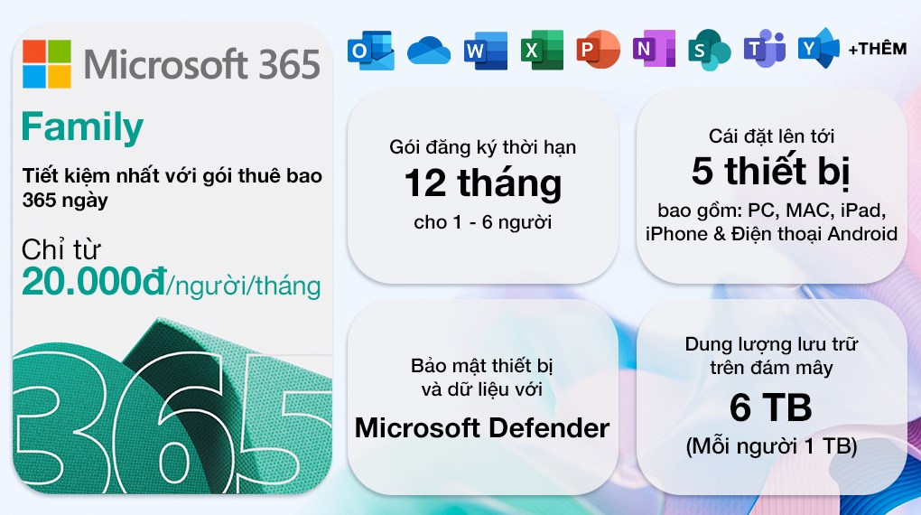 Microsoft 365 Family là gói phần mềm văn phòng toàn diện từ Microsoft, được thiết kế đặc biệt để phục vụ cho nhu cầu cùng lúc của 6 người. Với bộ công cụ mạnh mẽ và tính năng vượt trội, Microsoft 365 Family không chỉ hỗ trợ công việc hiệu quả mà còn mang lại trải nghiệm công nghệ tiên tiến cho tổng 6 thành viên trong gia đình hoặc nhóm.