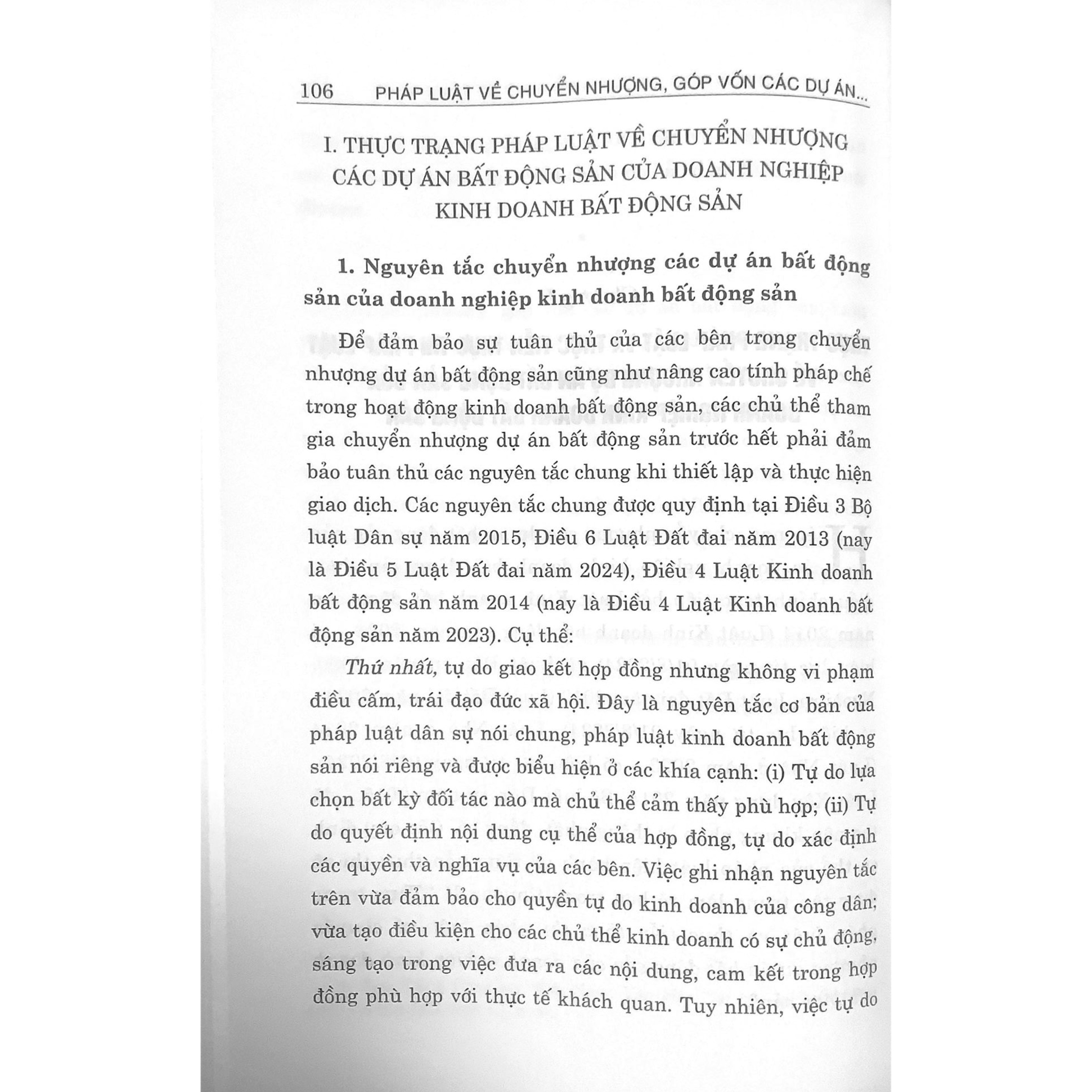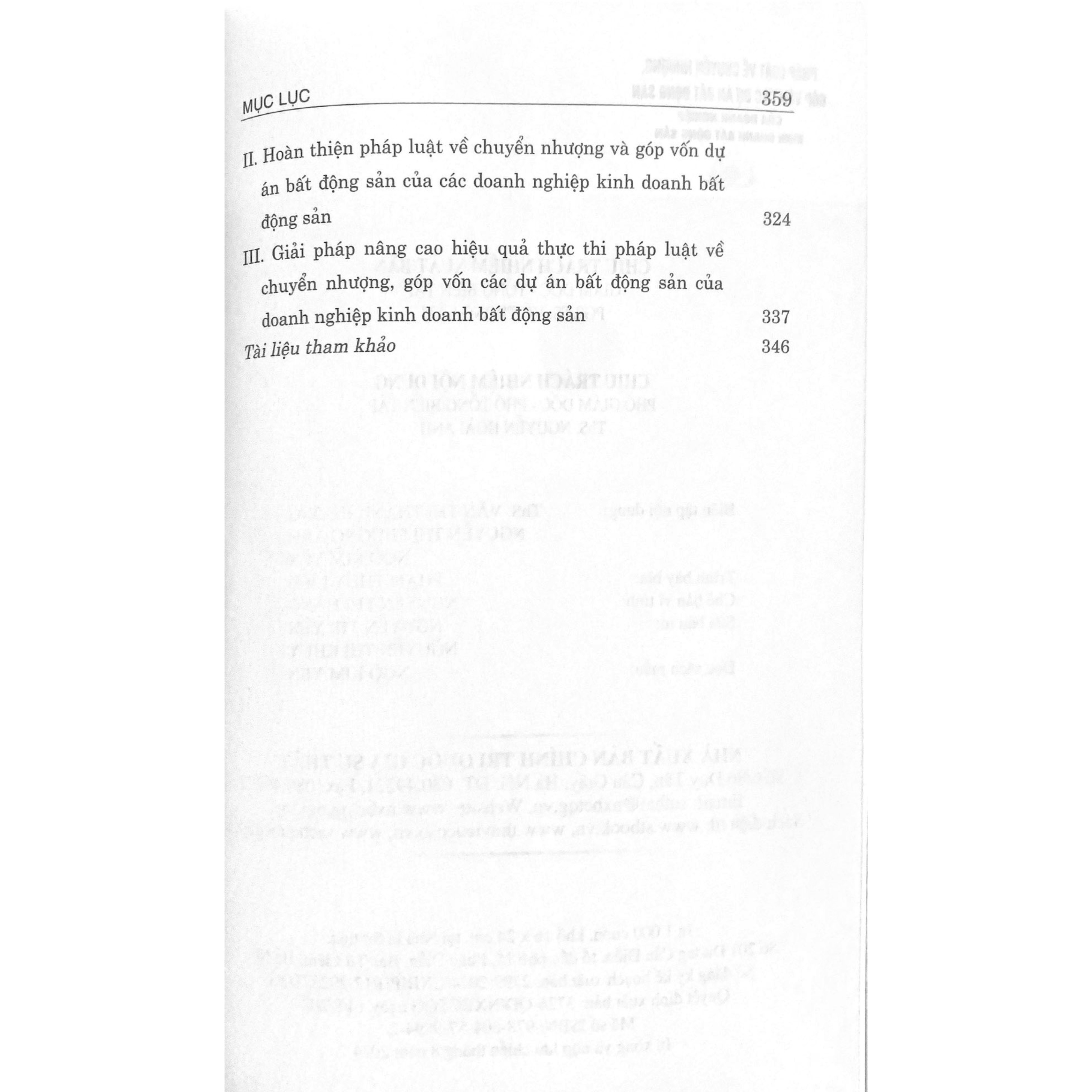 Trên cơ sở nghiên cứu và so sánh, phân tích, đánh giá thực trạng pháp luật, thực tiễn thực thi pháp luật, cuốn sách Pháp luật về chuyển nhượng, góp vốn các dự án bất động sản của doanh nghiệp kinh doanh bất động sản (Sách chuyên khảo) của Nhà xuất bản Chính trị quốc gia Sự thật, do PGS. TS. Nguyễn Thị Nga - Khoa Pháp luật kinh tế, Trường Đại học Luật Hà Nội làm chủ biên, tập trung làm rõ những vấn đề lý luận về chuyển nhượng, góp vốn các dự án kinh doanh bất động sản dưới góc nhìn đa chiều; phân tích, đánh giá thực tiễn thực thi pháp luật về các hoạt động này, qua đó đề xuất những giải pháp hoàn thiện pháp luật, nâng cao hiệu quả áp dụng pháp luật về hoạt động chuyển nhượng, góp vốn dự án bất động sản, hướng tới sự phát triển ổn định và bền vững của thị trường này tại Việt Nam.