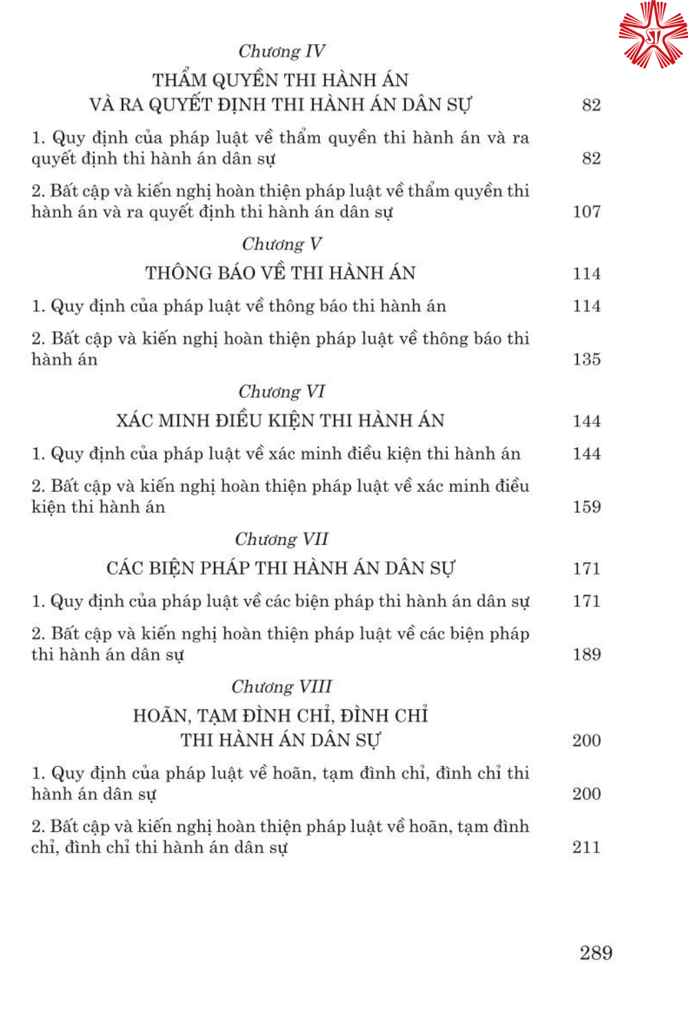''Pháp luật thủ tục thi hành án dân sự'' Nội dung cuốn sách bao gồm 10 chương, tập trung phân tích từng vấn đề cụ thể về thủ tục trong thi hành án dân sự hiện nay ở Việt Nam và liên hệ với pháp luật thi hành án dân sự ở một số quốc gia trên thế giới.