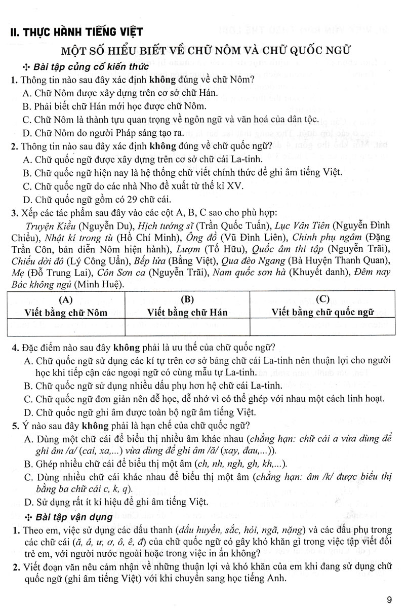 • Thực hành Tiếng Việt: Gồm hệ thống bài tập ở 2 mức độ (không trùng với các bài tập trong sách giáo khoa): Bài tập củng cố kiến thức nhằm giúp học sinh ôn lại kiến thức đã học. Bài tập vận dụng nhằm giúp học sinh vận dụng kiến thức đã học vào một tình huống sử dụng ngôn ngữ mới.