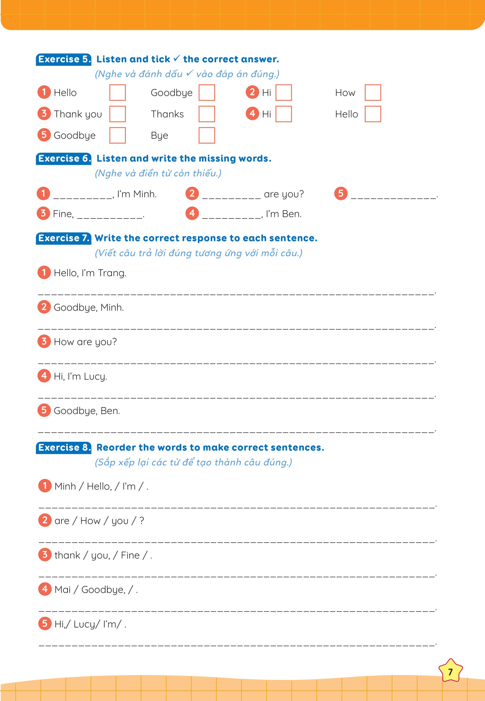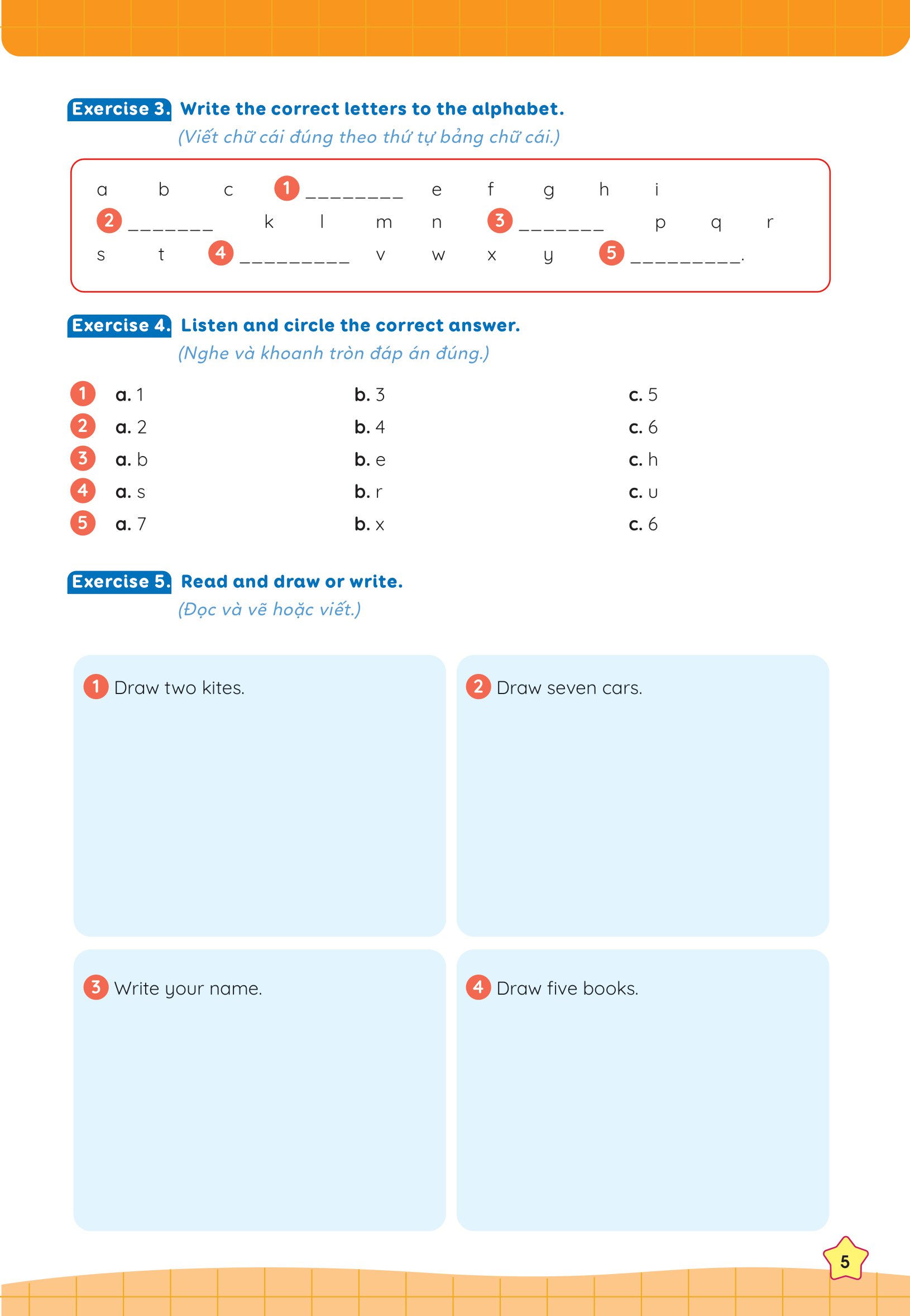 Mỗi bài tập đi kèm với mã QR cho phép truy cập vào file nghe phát âm chuẩn của từ vựng. Điều này giúp các em học sinh luyện nghe và học phát âm chính xác ngay từ đầu, xây dựng nền tảng ngôn ngữ vững chắc.