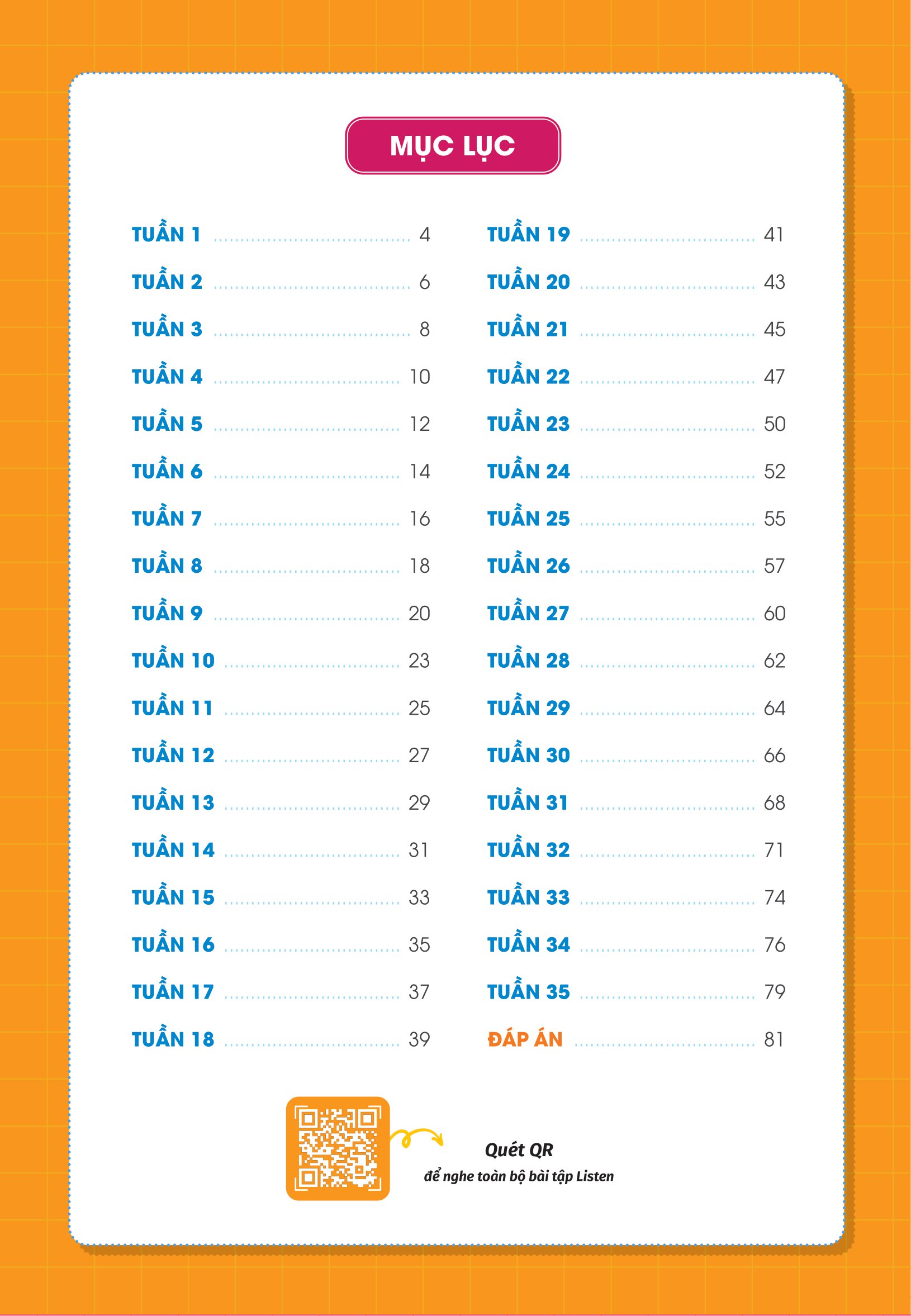 Bộ sách gồm các bài luyện tập chia theo tuần, ôn tập tổng quát kiến thức của 35 tuần học. Ngoài ra, cuốn sách cũng cung cấp các bài kiểm tra giữa kỳ và cuối kỳ để các con trau dồi thêm, tự tin chinh phục điểm cao trong các bài kiểm tra trên lớp.