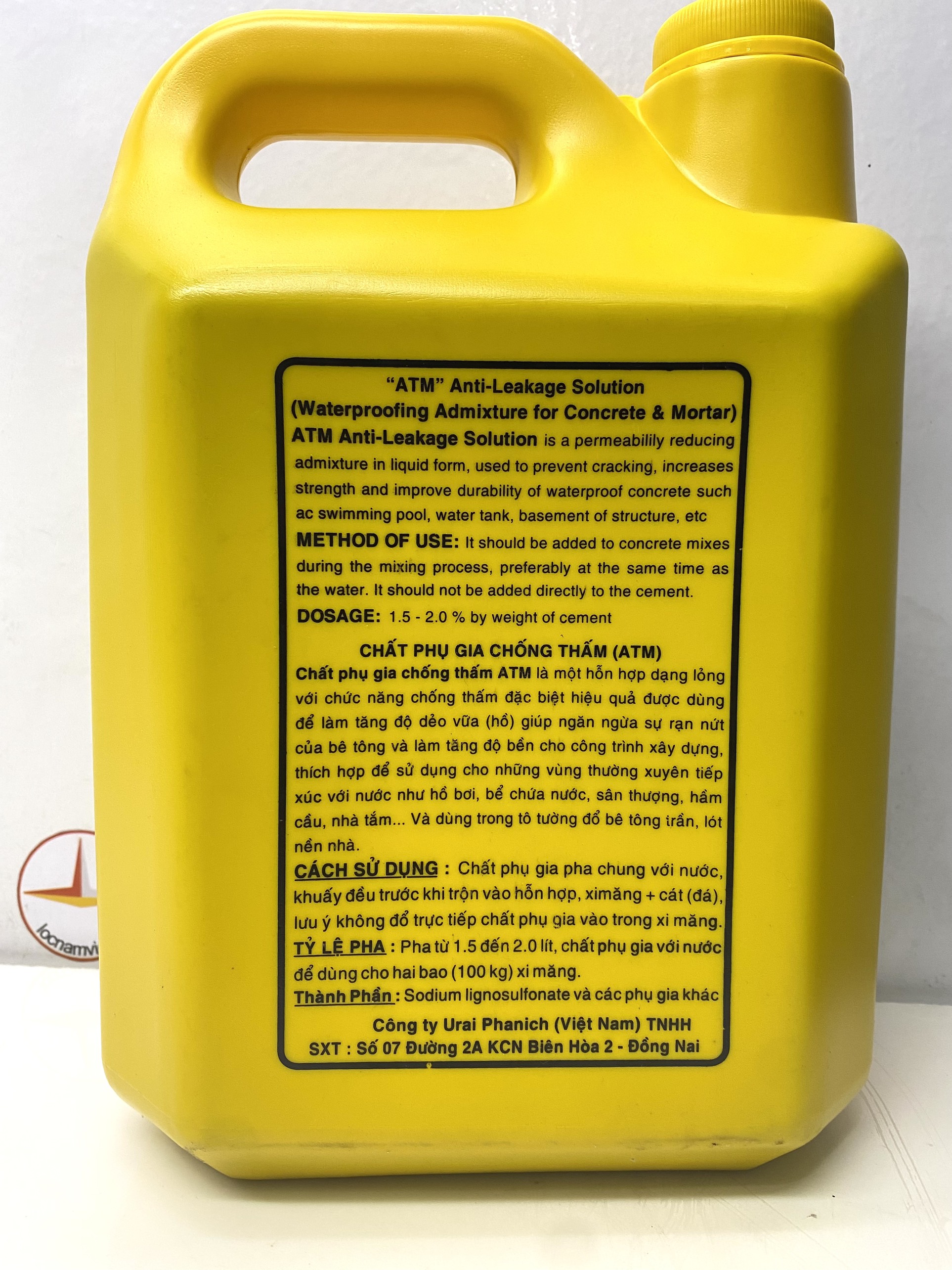Mua tại TiktokPHỤ GIA CHỐNG THẤM ATM Là một hỗn hợp dạng lỏng với chức năng chống thấm đặc biệt hiệu quả được dùng để làm tăng độ dẻo vữa (hồ) giúp ngăn ngừa sự rạn nứt của bê tông(phụ gia ATM sẽ phá các bọt khí trong bê tông) và làm tăng độ bền cho công trình xây dựng. Sản phẩm thích hợp để sử dụng cho những vùng thường xuyên tiếp xúc với nước như hồ bơi, bể chứa nước, sân thượng, hầm cầu, nhà tắm, Và dùng trong tô tường đổ bê tông trần, lót nền nhà. TỶ LỆ PHA CÁCH SỬ DỤNG: Chất pha chung với nước và khuấy đều trước khi trộn vào hỗn hợp, xi măng + cát (đá). Lưu Ý: Không đổ trực tiếp chất phụ gia vào trong xi măng sẽ làm chín xi măng. Pha từ 1.5 đến 2.0 lít chất phụ gia với nước để dùng cho 2 bao (100 kg) xi măng. Thể tích thực: 4,5 lít Màu sắc: Đen