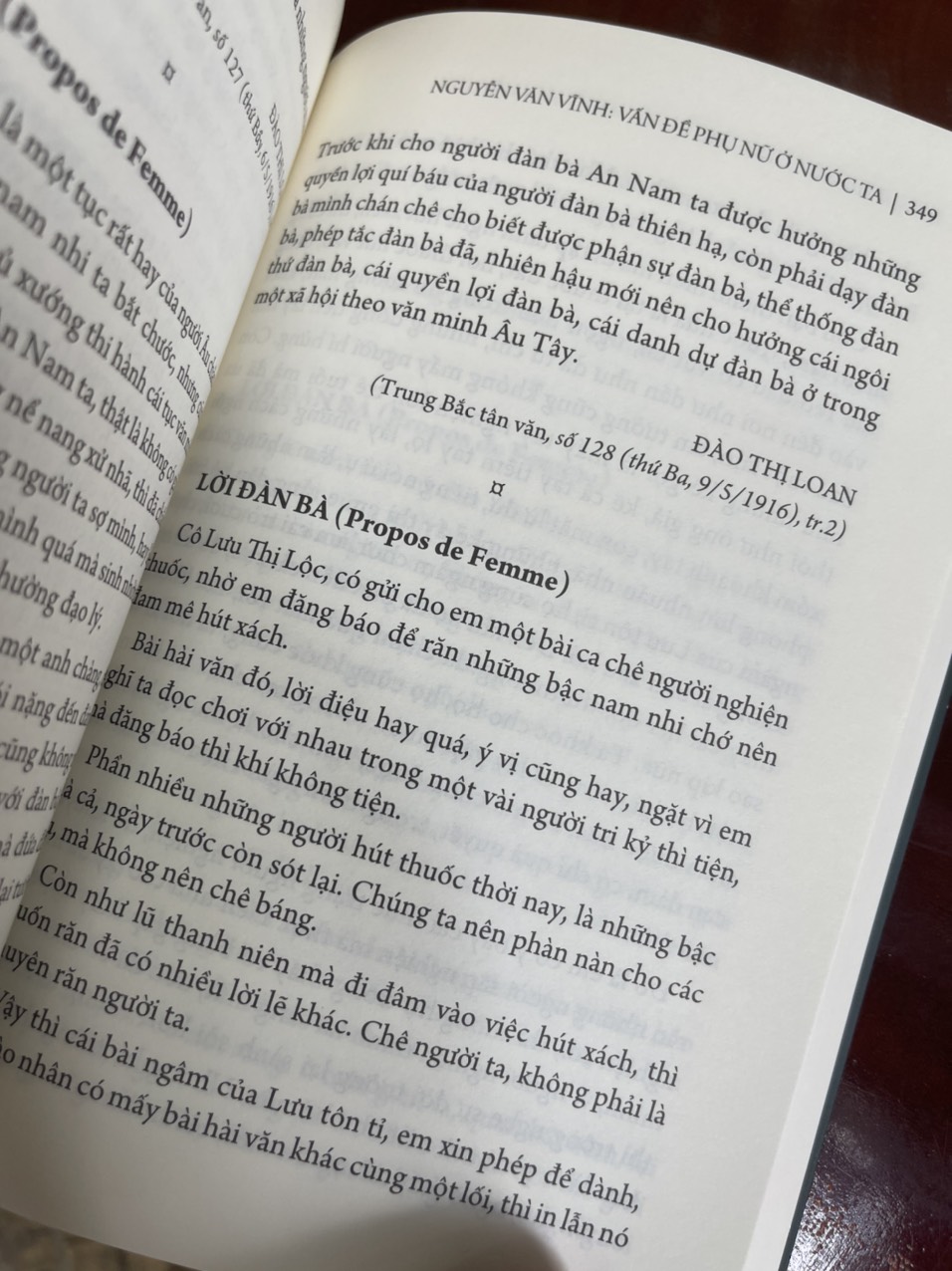 “Các bạn độc giả cũng biết rằng, chúng tôi không phải những người theo chủ nghĩa nữ quyền. Tại sao ư, vì chúng tôi không phân biệt nam nữ ở mọi nơi, trừ những lĩnh vực liên quan đến giới tính. Một nữ bác học, một nữ tri thức, một nữ nghệ sỹ hay một người phụ nữ thực hiện một công việc bất kỳ, dưới con mắt chúng tôi, chỉ đơn giản là một con người, người mà do ngẫu nhiên, mang một giới tính khác, cái giới tính cũng ngang bằng về mọi mặt với giới tính của phần còn lại…”