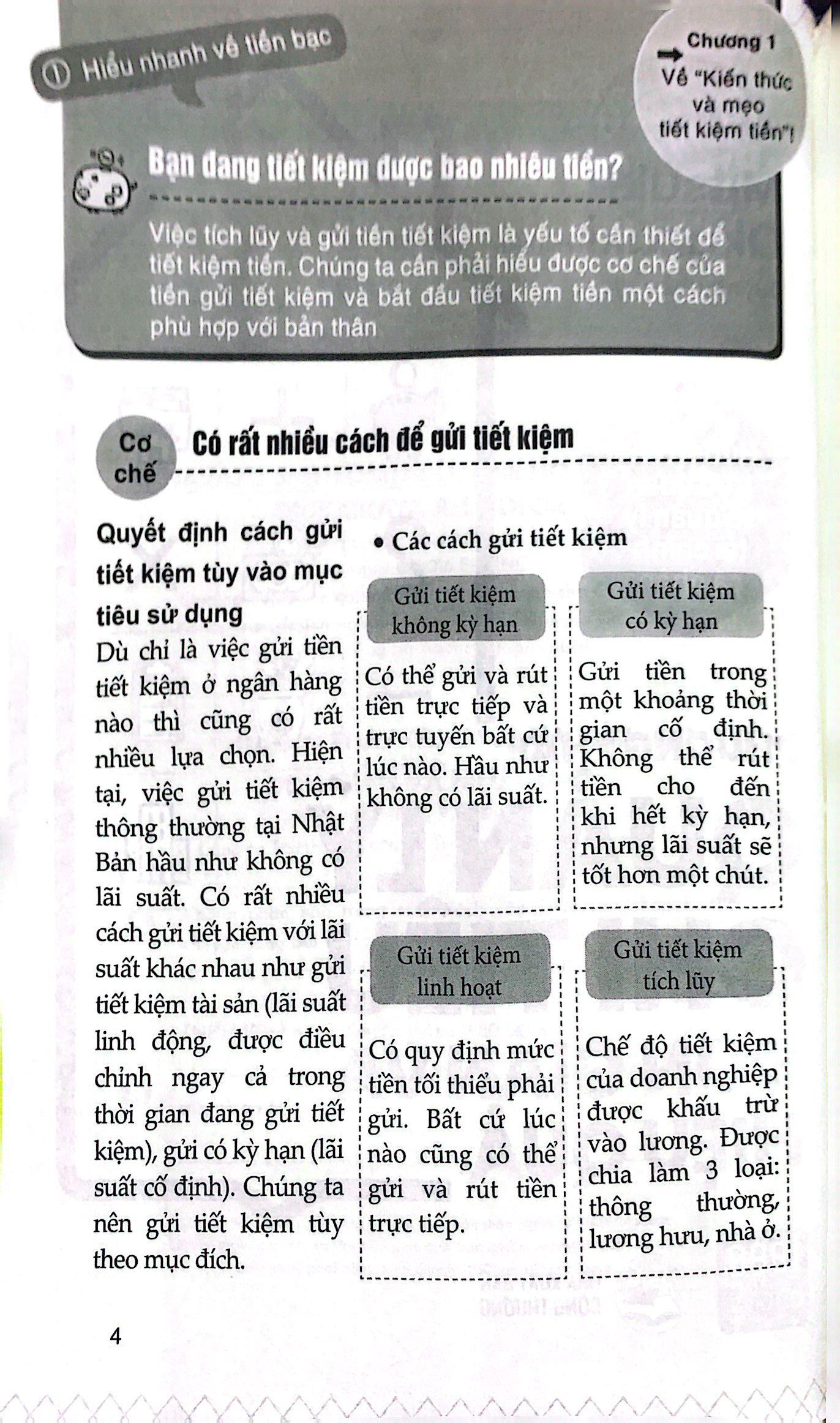 Phương Pháp Quản Lý Chi Tiêu Đơn Giản Và Hiệu Quả “Đây không phải là thời đại mà lương sẽ tăng liên tục theo từng năm”. Đây là điều mà không ai có thể phủ nhận. Dù nhà nước có thực hiện các biện pháp kinh tế như thế nào đi nữa thì nền kinh tế cũng sẽ không tăng lên mà chỉ đủ sức để duy trì. Nó giống như việc đi “thang cuốn lên” vào ngày xưa vậy. Và bây giờ là lúc bạn đi thang cuốn xuống. Nếu cứ để nguyên như vậy thì cuộc sống sinh hoạt của bạn có thể trở nên tồi tệ hơn. Nói một cách chính xác, khoảng cách giữa những người có tiền và những người không có tiền sẽ ngày càng lớn. Thực tế đáng buồn là không nhiều người có thể hoạch định tương lai tài chính của m.ình một cách đúng đắn. Vì sao? Vì bạn chưa có dự định để làm điều đó. Vì bạn không biết phải làm như thế nào. Và vì kiến thức về tiền bạc của bạn không đủ để có thể lập nên một kế hoạch sử dụng tiền hoàn hảo. Nói cách khác, chỉ cần có “kiến thức về tiền bạc” là có thể chống lại thời kỳ suy thoái này. Bạn có thể bị chùn bước khi nghe cụm “kiến thức về tiền bạc”. Tuy nhiên, nếu đối mặt đúng cách thì cũng không quá khó khăn. Cuốn sách này mô tả một cách dễ hiểu về định hướng sử dụng tiền đúng đắn với tiêu chí “những người có thu nhập cao không nhất thiết phải tiết kiệm nhiều”. Mỗi chương của cuốn sách sẽ là chìa khóa giải mã bí quyết cân bằng chi tiêu và tiết kiệm: từ bảo hiểm, quản lý tài sản, cơ chế cho vay, thuế, cho đến tiền chi cho hôn nhân, nuôi con, chăm sóc, thừa kế cha mẹ, tiền về già… Được biên soạn dưới góc nhìn của một chuyên gia về tiền bạc cùng hình minh họa sinh động, cuốn sách chính là cơ hội để bạn có những bước đi đầu tiên cho tương lai tươi sáng của m.ình. Hãy nắm bắt cơ hội đó ngay bây giờ!