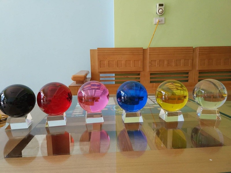 Quả cầu phong thủy bằng pha lê với nhiều màu sắc như màu xanh lá, màu trong suốt, đen, đỏ, vàng, hồng, xanh dương,ù hợp với từng mệnh.