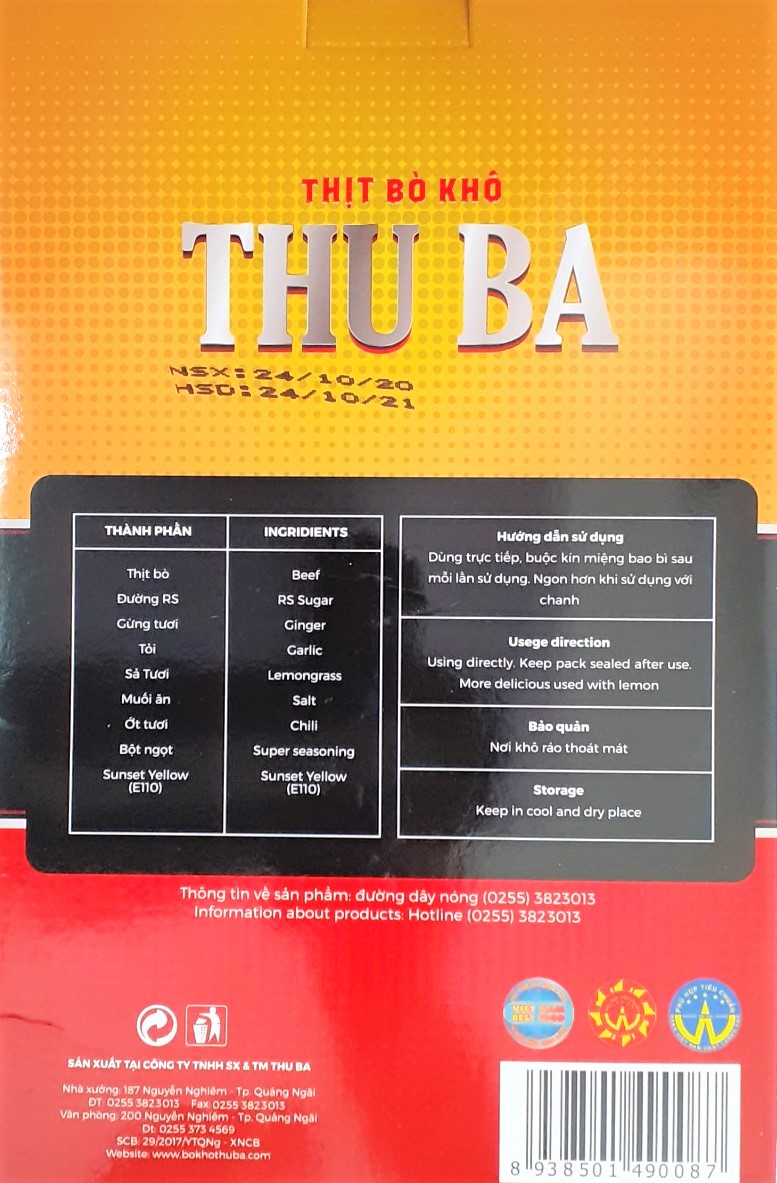 BÒ KHÔ THU BA là món đặc sản Quảng Ngãi, đạt tiêu chuẩn ISO 22000 và là Hàng Việt Nam Chất Lượng Cao do Người tiêu dùng bình chọn từ 2017 đến 2024 Sản phẩm được sản