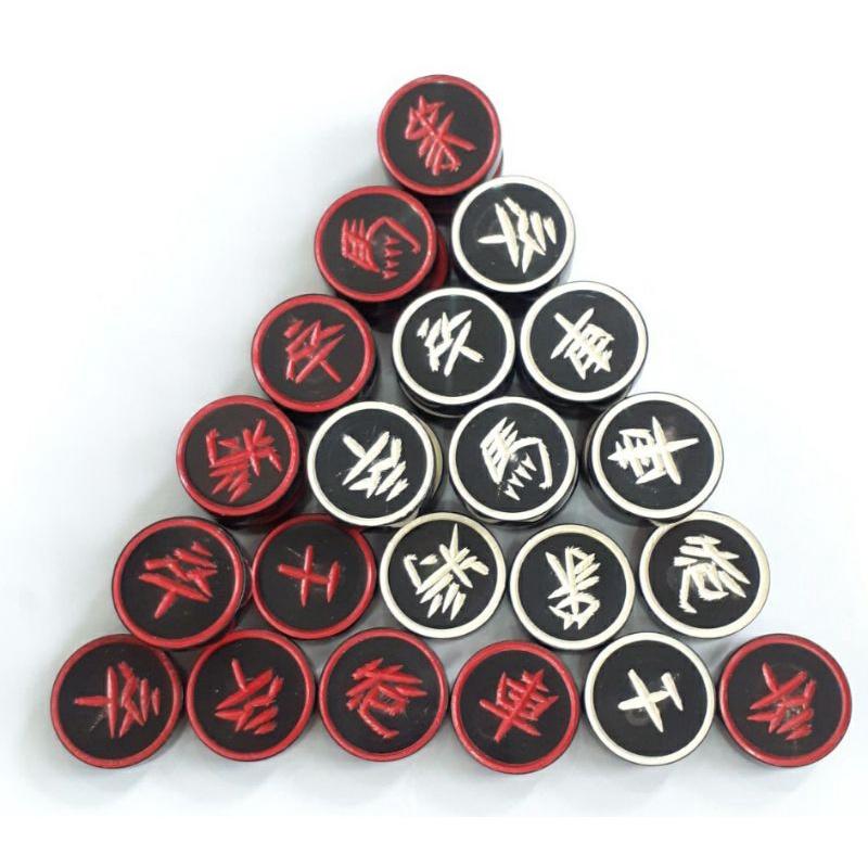 Quân cờ sừng đên hai bên, 16 quân chữ mầu trắng và 16 quân chữ mầu đỏ, quân cờ sừng trâu đen.