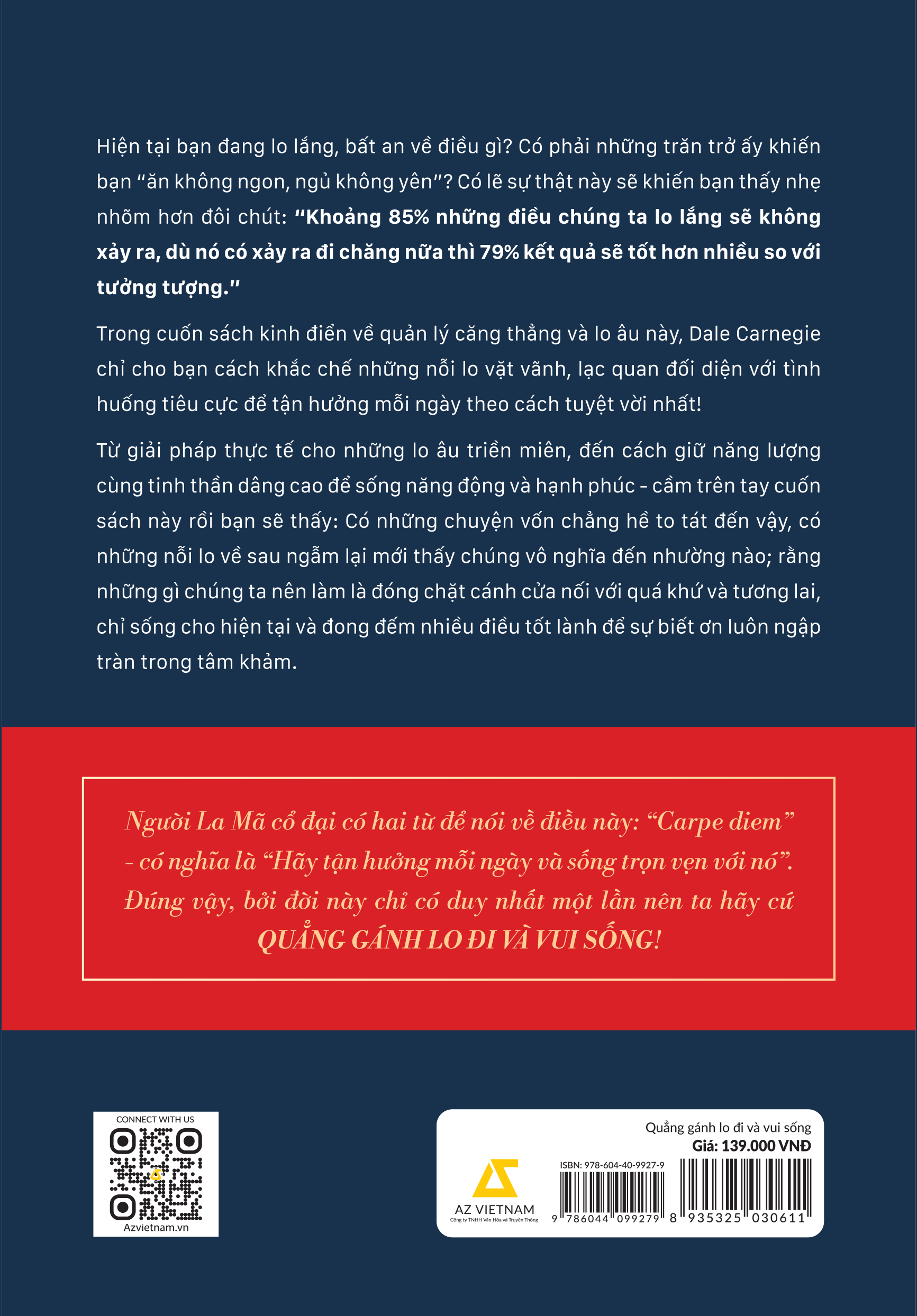 Chiến tranh, dịch bệnh, khủng hoảng kinh tế, áp lực học hành, căng thẳng trong công việc, gia đình… Lo lắng không phân biệt thời gian hay đối tượng. Những thứ thuộc về bản chất con người thì khó lòng nào đổi thay. Bởi vậy, những nguyên tắc quản lý lo âu của DALE CARNEGIE trong cuốn QUẲNG GÁNH LO ĐI VÀ VUI SỐNG vẫn chạm đến nhu cầu của mọi người ở bất kể quốc gia, dù là năm 1948 hay 100 năm về sau nữa.