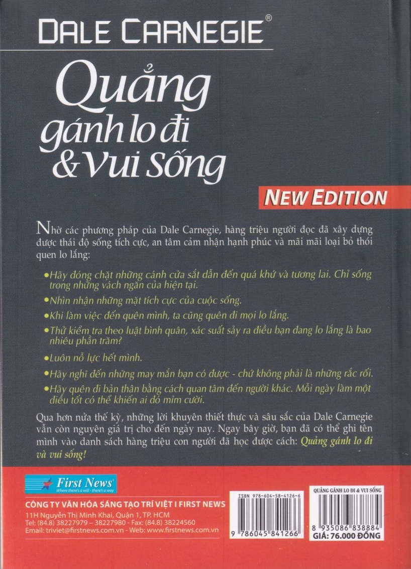 Quẳng Gánh Lo Đi Và Vui Sống là cuốn sách mà cái tên đã nói lên tất cả nội dung chuyển tải trên những trang giấy. Bất kỳ ai đang sống đều sẽ có những lo lắng thường trực về học hành, công việc, những hoá đơn, chuyện nhà cửa,… Cuộc sống không dễ dàng giải thoát bạn khỏi căng thẳng, ngược lại, nếu quá lo lắng, bạn có thể mắc bệnh trầm cảm. Quẳng Gánh Lo Đi Và Vui Sống khuyên bạn hãy khóa chặt dĩ vãng và tương lai lại để sống trong cái phòng kín mít của ngày hôm nay. Mọi vấn đề đều có thể được giải quyết, chỉ cần bạn bình tĩnh và xác định đúng hành động cần làm vào đúng thời điểm. Nói thì có vẻ dễ nhưng những vấn đề liên quan đến các trạng thái tinh thần chẳng bao giờ dễ giải quyết. Chấm dứt lo lắng là điều không thể nhưng bớt đi sự lo lắng thì có thể, chỉ cần bạn đủ quyết tâm. Quẳng Gánh Lo Đi Và Vui Sống khuyên bạn những cách để giảm thiểu lo lắng rất đơn giản như chia sẻ nó với người khác, tìm cách giải quyết vấn đề, quên tất cả những điều lo lắng nằm ngoài tầm tay, Cố gắng thực tập điều này hàng ngày và trong cuộc sống chắc hẳn bạn sẽ thành công, có thể, không được như bạn muốn, nhưng chỉ cần bớt đi một chút phiền muộn thì cuộc sống của bạn đã có thêm một niềm vui. Nhờ các phương pháp của Dale Carnegie, hàng triệu người đọc đã xây dựng được thái độ sống tích cực, an tâm cảm nhận hạnh phúc và mãi mãi loại bỏ thói quen lo lắng: Hãy đóng chặt những cánh cửa sắt dẫn đến quá khứ và tương lai. Chỉ sống trong những vách ngăn của hiện tại. Nhìn nhận những mặt tích cực của cuộc sống Khi làm việc đến quên mình, ta cũng quên đi mọi lo lắng Thử kiểm tra theo luật bình quân, xác suất xảy ra điều bạn đang lo lắng là bao nhiêu phần trăm? Luôn nỗ lực hết mình Hãy nghĩ đến những may mắn bạn có được chứ không phải là những rắc rối Hãy quên đi bản thân bằng cách quan tâm đến người khác. Mỗi ngày làm một điều tốt có thể khiến ai đó mỉm cười. Qua hơn nửa thế kỷ, những lời khuyên thiết thực và sâu sắc của Dale Carnegie vẫn còn nguyên giá trị cho đến ngày nay. Ngay bây giờ, bạn đã có thể ghi tên mình vào danh sách hàng triệu con người đã học được cách: Quẳng gánh lo đi và vui sống! BÁO CHÍ NÓI VỀ CUỐN SÁCH “Đây là cuốn sách kinh điển, được xem là cẩm nang giúp người đọc có thể tự nhìn nhận và vượt qua sự lo lắng, bất an của bản thân”. - Nhịp cầu đầu tư VỀ TÁC GIẢ Dale Breckenridge Carnegie (24 tháng 11 năm 1888 – 1 tháng 11 năm 1955) là một nhà văn và nhà thuyết trình Mỹ và là người phát triển các lớp tự giáo dục, nghệ thuật bán hàng, huấn luyện đoàn thể, nói trước công chúng và các kỹ năng giao tiếp giữa mọi người. Ra đời trong cảnh nghèo đói tại một trang trại ở Missouri, ông là tác giả cuốn Đắc Nhân Tâm, được xuất bản lần đầu năm 1936, một cuốn sách thuộc hàng bán chạy nhất và được biết đến nhiều nhất cho đến tận ngày nay. Ông cũng viết một cuốn tiểu sử Abraham Lincoln, với tựa đề Lincoln con người chưa biết, và nhiều cuốn sách khác. Carnegie là một trong những người đầu tiên đề xuất cái ngày nay được gọi là đảm đương trách nhiệm, dù nó chỉ được đề cập tỉ mỉ trong tác phẩm viết của ông. Một trong những ý tưởng chủ chốt trong những cuốn sách của ông là có thể thay đổi thái độ của người khác khi thay đổi sự đối xử của ta với họ. Trích đoạn hay Ngày hôm nay chính là tài sản quý giá nhất của chúng ta. Nó là tài sản duy nhất chúng ta chắc chắn có. Trên bàn làm việc của nhà văn John Ruskin có một hòn đá đơn sơ, trên đó nổi bậc một từ rõ nét: Ngày hôm nay. Tuy không có hòn đá như thế nhưng tôi đã dán một bài thơ lên tấm gương soi để mình có thể nhìn vào mỗi sáng. Đó là bài thơ của Kalidasa, nhà soạn kịch nổi tiếng người Ấn Độ. LỜI CHÀO NGÀY MỚI Hãy sống trọn vẹn ngày hôm nay! Vì đó chính là cuộc sống, cuộc sống thực sự Một ngày – Ôi thời gian ngắn ngủi! Chứa trọn mọi điều sự thật đời ta: Niềm vui trưởng thàn Sự hãnh diện khi hành động Nét rực rỡ của dung nhan. Quá khứ chỉ là một giấc mơ Và tương lai là một viễn ảnh. Sống hết mình trong hiện tại là làm đẹp mỗi ngày qua Và biến mỗi ngày mai thành ngày chứa chan hy vọng … Vì thế, để thoát khỏi những lo lắng, phiền muộn, điều đầu tiên bạn cần phải làm là: “Hãy đóng chặt những cánh cửa nặng nề dẫn đến quá khứ và tương lai. Hãy sống với ngày hôm nay, tận dụng tối đa 24 giờ quý giá của một ngày.” Sao bạn không tự hỏi bản thân mình và đi tìm câu trả lời cho những câu hỏi sau: 1/ Liệu tôi có đang lảng tránh cuộc sống hiện tại vì cứ mãi lo nghĩ cho tương lai hay mơ tưởng đến “một vườn hồng huyền ảo ở tít tận chân trời”. 2/ Liệu tôi có làm u ám ngày hôm nay của mình bằng những hối tiếc về những đi