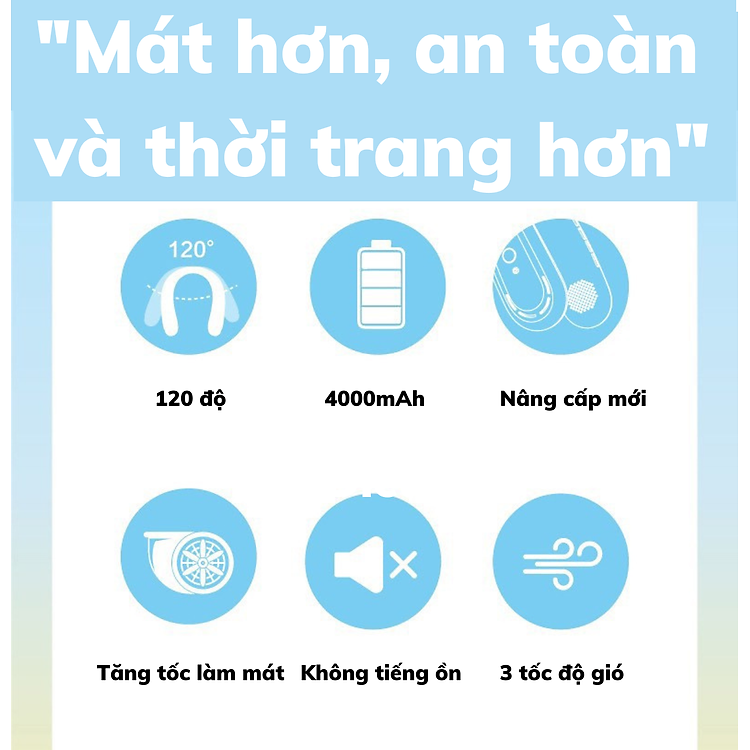 Quạt Fan mini đeo cổ / choàng cổ hiệu WiWU Halter Neck Fan FS02 - thổi gió góc 120 độ, không cánh quạt hạn chế tiếng ồn, hoạt động lên lên đến 10h       ƯU ĐIỂM ĐẾN TỪ THIẾT KẾ VÀ SỰ ĐA NĂNG Quạt Fan mini đeo cổ / choàng cổ hiệu WiWU Halter Neck Fan FS02 sử dung pin sạc phù hợp khi đi học, du lịch, dã ngoại và văn phòng . Thiết kế nhỏ gọn, tiện lợi giúp bạn có thể mang theo khắp mọi nơi.Sản phẩm hoạt hoạt động trên nguyên lý tuabin khí không có cánh quat với 3 mức tốc độ gió phổ biến. Những điểm ưu việt của chiếc Quạt Fan mini đeo cổ / choàng cổ hiệu WiWU Halter Neck Fan FS02: Thiết kế nhỏ gọn, thích hợp cho các chuyến đi bộ hoặc du lịch xa trong lúc thời tiết nóng bức. Là một món quà vô cùng đặc biệt để tặng bạn trong các dịp lễ hoặc sinh nhật. Một người bạn đồng hành tuyệt vời theo bạn đi khắp mọi nơi. Sản phẩm không có cánh quạt, hoạt động bằng tua bin khí nên không gây rối  tóc hay tiếng ồn. Thời gian sử dụng cực kỳ ấn tượng lên đến 10h.     THIẾT KẾ DẠNG ĐEO CỔ THÍCH HỢP CHO VẬN ĐỘNG THỂ THAO Quạt Fan mini đeo cổ / choàng cổ hiệu WiWU Halter Neck Fan FS02 được thiết kế chắc chắn, khi đeo vào cổ, ngoài ra nó còn có thể điều chỉnh co lại hay giãn ra phù hợp với từng người dùng khác nhau từ 10-30cm, vật liệu cao cấp cũng mang đến sự dễ chịu và êm ái khi tiếp xúc dài lâu, nó phù hợp với các hoạt động thể thao ngoài trời, học tập, dã ngoại, du lịch,       CÔNG NGHỆ TUA BIN KHÍ KHÔNG CÁNH QUẠT Quạt Fan mini đeo cổ / choàng cổ hiệu WiWU Halter Neck Fan FS02 được tích hợp công nghệ tuabin khí mới hiện nay, quạt không cánh nên sẽ không gây ra hiện tượng tóc cuốn vào cánh quạt gây khó chịu cho người dùng. Ngoài ra công nghệ này còn mang đến trải nghiệm êm ái khi không gây ra tiếng ốn nào khi sử dụng. Gió thổi từ quạt không nằm một chỗ mà rộng góc 120 độ mang đến cảm giác mát lạnh toàn diện và rộng hơn.     CỔNG SẠC BẰNG ĐẦU MICRO USB TIỆN DỤNG Quạt Fan mini đeo cổ / choàng cổ hiệu WiWU Halter Neck Fan FS02 có cổng sạc bằng đầu USB, dễ dàng sạc lại cho quạt bằng cách cắm trực tiếp cổng sạc USB vào máy tính. Bạn có thể sạc pin cho quạt bằng tổng thể dự phòng của điện thoại di động ngay khi đi du lịch hoặc sạc cho quạt trực tiếp bằng điện.     CHẤT LƯỢNG PIN SẠC CAO CẤP Quạt Fan mini đeo cổ / choàng cổ hiệu WiWU Halter Neck Fan FS02  Được trang bị viên pin Lithium có xuất xứ từ Hàn Quốc mang lại khả năng sử dụng lâu dài. Hạn chế chai pin trong quá trình sử dụng. Bạn hoàn toàn có thể yên tâm về chất lượng chiếc quạt này. Với Pin lithium-ion 3.7V 4000mAh, đèn có thể đáp ứng nhu cầu liên tục 10 giờ ở mức gió thấp, 6-7 giờ ở mức gió trung bình và 3-4h ở mức gió cao. Đèn báo sạc: CÓ (đèn báo sạc sẽ sáng khi đèn hoat động hoặc khi cắm sạc. Trong 02 trường hợp này, đèn luôn sáng) Một vài lưu ý về Pin mà bạn cần nhớ: Pin sạc trong sản phẩm sẽ HỎNG, hoặc không còn lưu điện tốt, NẾU sản phẩm không được sạc điện trong suốt thời gian 02 tháng (trường hợp sản phẩm còn mới 100%, chưa sử dụng, cũng phải cắm điện sạc lại Pin) định kỳ 2 tháng/ 1 lần để bảo vệ pin). Không nên sử dụng sản phẩm khi cắm sạc để bảo vệ pin sạc tránh tình trạng chai Pin.     3 CẤP ĐỘ GIÓ THÔNG DỤNG Quạt Fan mini đeo cổ / choàng cổ hiệu WiWU Halter Neck Fan FS02 có 03 cấp độ gió giúp bạn chủ động được tốc độ gió khi cần sử dụng: nhẹ nhàng hoặc gió mạnh. Sản phẩm được làm bằng chất liệu nhựa ABS cao cấp, độ bền cao và sử dụng tuabin khí không cánh quạt, yên tĩnh, không nóng máy, đảm bảo an toàn cho người dùng.     HÌNH ẢNH THỰC TẾ SẢN PHẨM