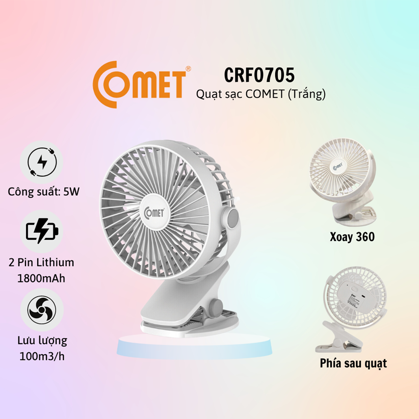 Quạt Sạc Comet CRF0705 có thiết kế nhỏ gọn, đẹp mắt, có thể mang theo mọi lúc mọi nơi. Sản phẩm thích hợp cho nhiều đối tượng sử dụng khác nhau: nhân viên văn phòng, các bạn sinh viên,