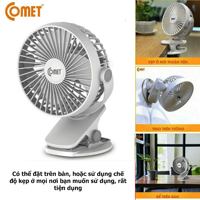 Quạt sạc Comet có cổng sạc bằng đầu USB, dễ dàng sạc lại cho quạt bằng cách cắm trực tiếp cổng sạc USB vào máy tính. Bạn có thể sạc pin cho quạt bằng cục sạc dự phòng của điện thoại ngay khi đi du lịch hoặc sạc cho quạt trực tiếp bằng điện.