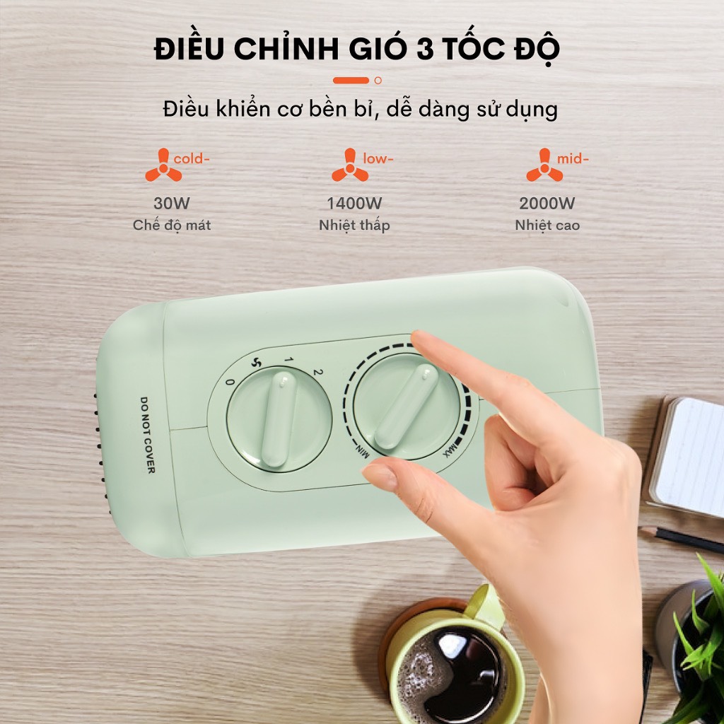 Quạt Sưởi Gốm Mini FH1200 Sưởi Ấm Cực Nhanh, 3 Tốc Độ Gió Dùng Quanh Năm, Điều khiển Cơ Bền Bỉ
