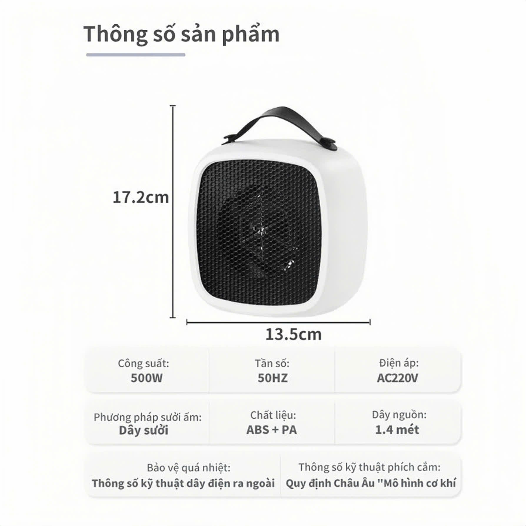 - Với thiết kế nhỏ gọn, dễ dàng di chuyển và không chiếm nhiều diện tích, quạt sưởi mini giúp làm ấm không gian làm việc nhanh chóng. ***THÔNG SỐ KỸ THUẬT: