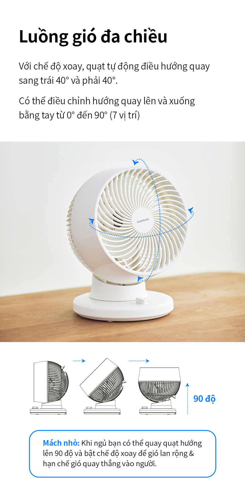 LUỒNG GIÓ ĐA CHIỀU: Với chế độ xoay, quạt tự động điều hướng quay sang trái 40° và phải 40°. Có thể điều chỉnh hướng quay lên và xuống bằng tay từ 0° đến 90° (7 vị trí).