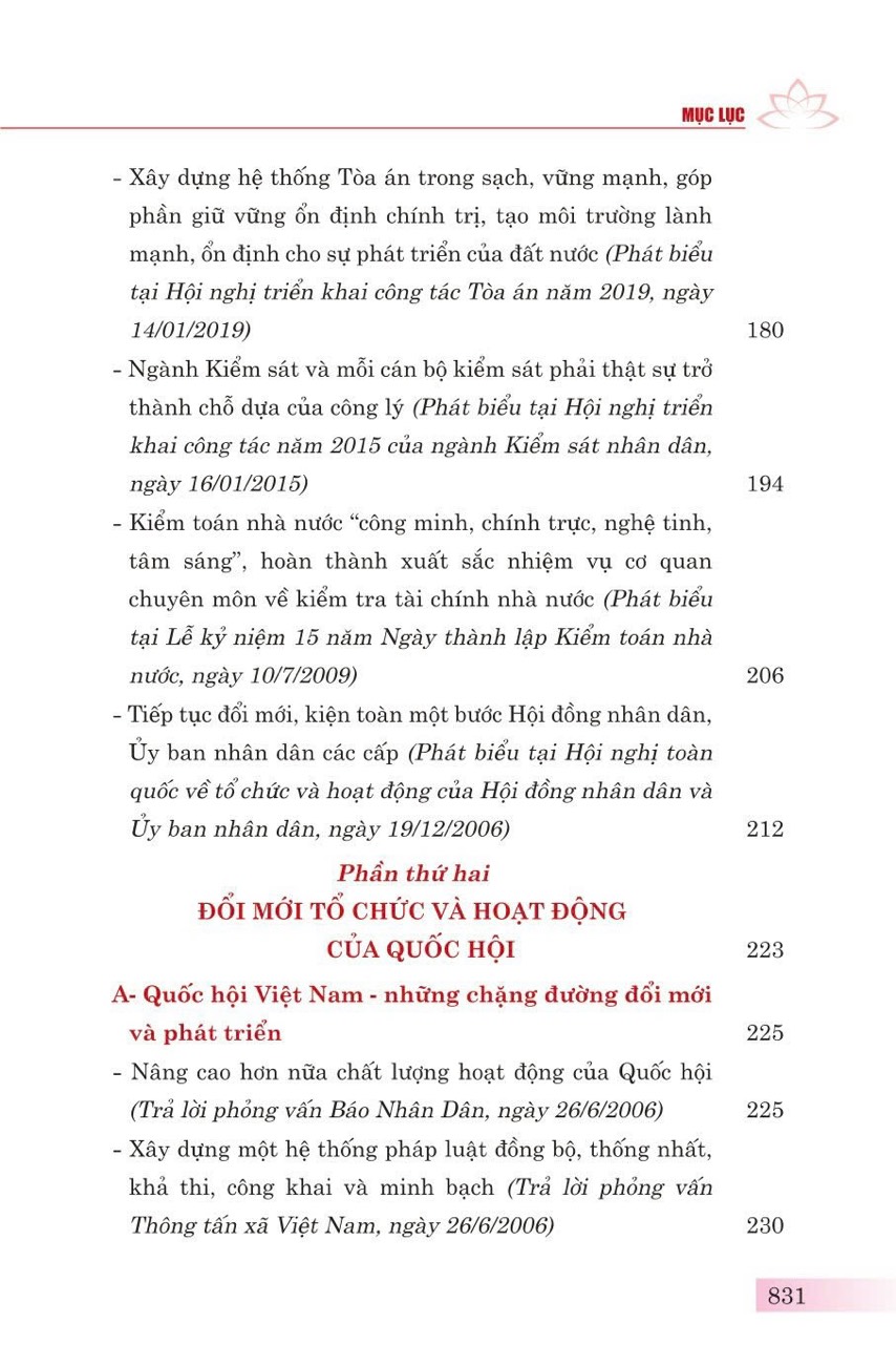 Cuốn sách tuyển chọn 95 bài viết, bài phát biểu và trả lời phỏng vấn của đồng chí Tổng Bí thư Nguyễn Phú Trọng về xây dựng, hoàn thiện Nhà nước pháp quyền xã hội chủ nghĩa Việt Nam và Quốc hội Việt Nam; tuyển chọn hơn 100 bức ảnh tư liệu quý và 57 ý kiến tiêu biểu của các đồng chí nguyên lãnh đạo Đảng, Nhà nước, đại biểu Quốc hội, Nhân dân và bạn bè quốc tế. Các bài viết, bài phát biểu trong cuốn sách thể hiện tư duy nhất quán và sự lãnh đạo toàn diện của đồng chí Tổng Bí thư đối với vấn đề đổi mới tổ chức, nâng cao hiệu lực, hiệu quả hoạt động của Quốc hội và xây dựng, hoàn thiện Nhà nước pháp quyền xã hội chủ nghĩa Việt Nam trong giai đoạn hiện nay.