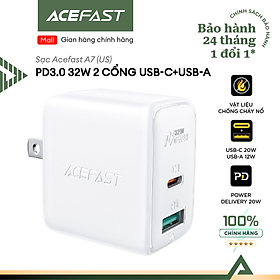 Sạc Acefast A7, 2 cổng USB-C PD3.0 20W và USB-A 12W, tổng công suất 32W phích cắm US, hỗ trợ hầu hết các giao thức sạc nhanh. Chất liệu PC chống cháy, chắc chắn và
