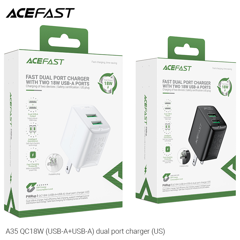 Sạc ACEFAST A35, 2 cổng USB-A QC18W, phích cắm US, hỗ trợ hầu hết các giao thức sạc nhanh. Thông số kỹ thuật: - Chất liệu: PC chống cháy. - Input: AC 100-240V, 0.6A, 50/60Hz, phích cắm US. - Output: Mỗi cổng ra: -