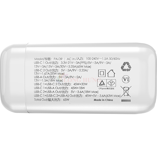 1. Màu đen 2. Đầu vào : 100-240V/0.5A chân cắm tròn chuẩn EU 3. Đầu ra : -USB-C1:5V/3A 9V/3A 12V/3A 15V/3A 20V/3.25A 65W Max - USB-C2:5V/3A 9V/3A 12V/3A 15V/3A 20V/3.25A 65W Max - USB-C3:5V/3A 9V/2A