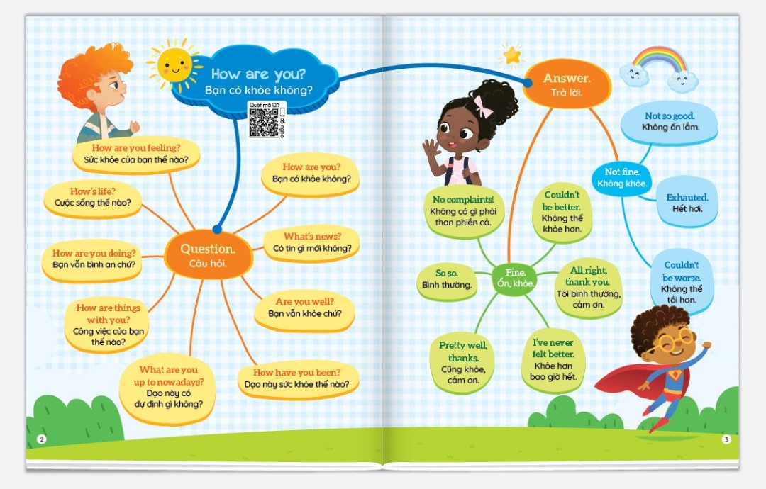 - KÈM THEO FILE ĐỌC TIẾNG ANH GIỌNG CHUẨN BẢN ĐỊA – QUÉT MÃ QR Để giúp cho trẻ có thể học nhanh, nhớ lâu, dễ dàng ôn tập, tự tin giao tiếp. Chúng tôi xin giới thiệu cuốn sách 1001 MẪU CÂU GIAO TIẾP TIẾNG ANH THÔNG DỤNG – THEO SƠ ĐỒ TƯ DUY MIND MAP, với hơn 30 chủ đề thường gặp trong cuộc sống hàng ngày và các mẫu câu giao tiếp thông dụng được trình bày theo dạng Sơ đồ tư duy Mind map rất logic, đơn giản và dễ hiểu. Kết hợp cùng với cuốn Chinh phục từ vựng tiếng Anh – Theo Sơ đồ tư duy Mind map, bộ 2 cuốn sách sẽ là cẩm nang giúp trẻ nắm vững hệ thống từ vựng tiếng Anh và giao tiếp tiếng Anh một cách tự tin, hiệu quả nhất. Đặc biệt, cuốn sách có kèm theo File đọc tiếng Anh giọng chuẩn bản địa, quét mã QR trên sách theo từng chủ đề, sẽ giúp trẻ luyện kĩ năng nghe – nói tốt hơn và phát âm chuẩn hơn. HƯỚNG DẪN BẢO QUẢN SÁCH THIẾU NHI:
