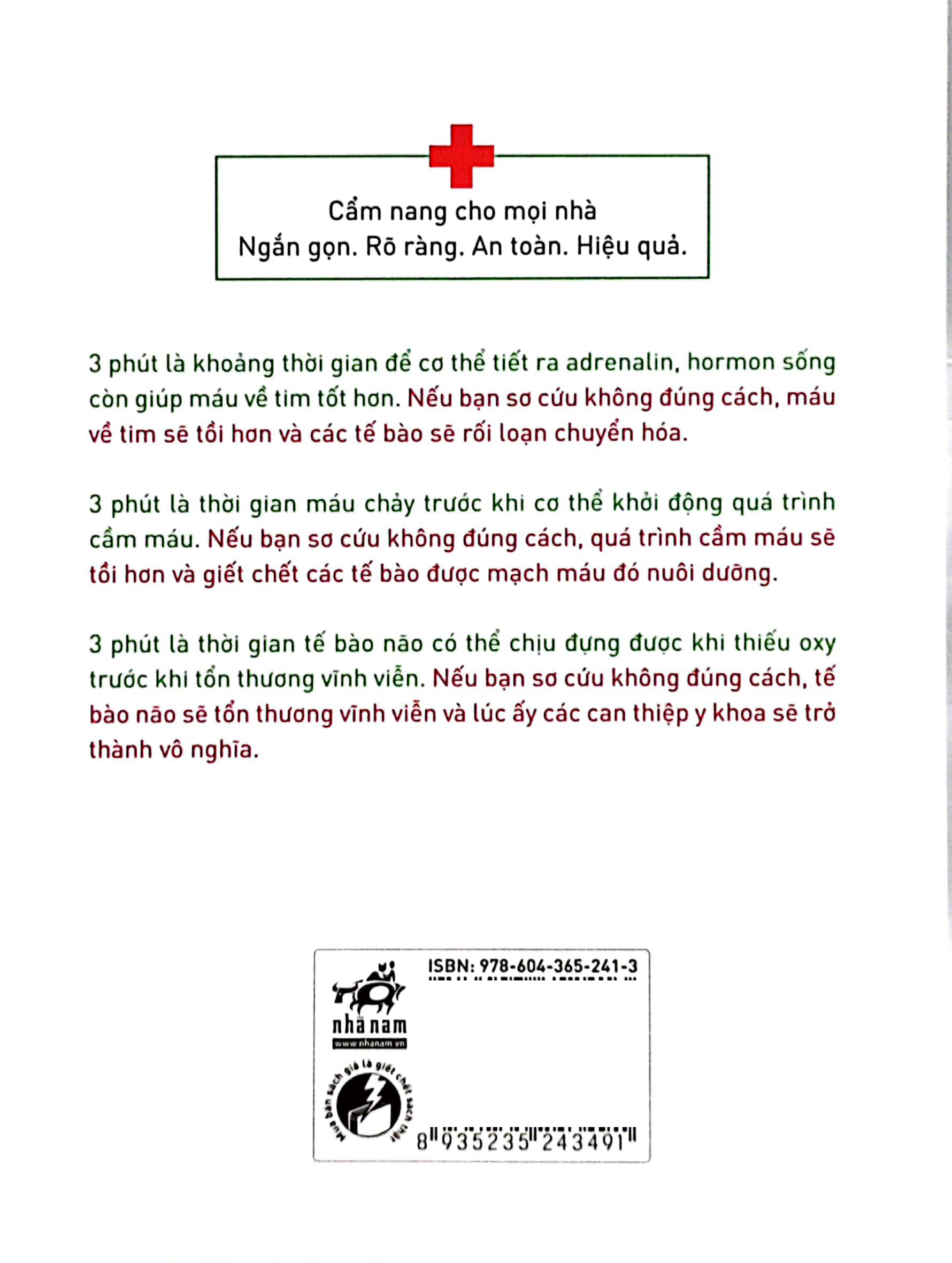 3 phút là khoảng thời gian để cơ thể tiết ra adrenalin, hormon sống còn giúp máu về tim tốt hơn. Nếu bạn sơ cứu không đúng cách, máu về tim sẽ tồi hơn và các tế bào sẽ rối loạn chuyển hóa. 3 phút là thời gian máu chảy trước khi cơ thể khởi động quá trình cầm máu. Nếu bạn sơ cứu không đúng cách, quá trình cầm máu sẽ tồi hơn và giết chết các tế bào được mạch máu đó nuôi dưỡng. 3 phút là thời gian tế bào não có thể chịu đựng được khi thiếu oxy trước khi tổn thương vĩnh viễn. Nếu bạn sơ cứu không đúng cách, tế bào não sẽ tổn thương vĩnh viễn và lúc ấy các can thiệp y khoa sẽ trở thành vô nghĩa.