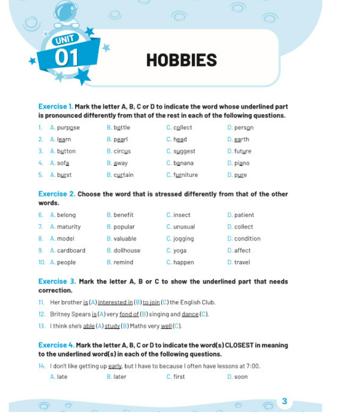 Phần thứ nhất gồm các bài tập ôn luyện được biên soạn theo các chủ đề dựa trên chương trình sách giáo khoa mới nhất. Phần thứ hai là phần luyện để học sinh giỏi của các trường. Bài tập dành cho mỗi đơn vị bài học bao gồm hơn 50 câu với đủ các dạng bài, ngữ âm, từ vựng và ngữ pháp.