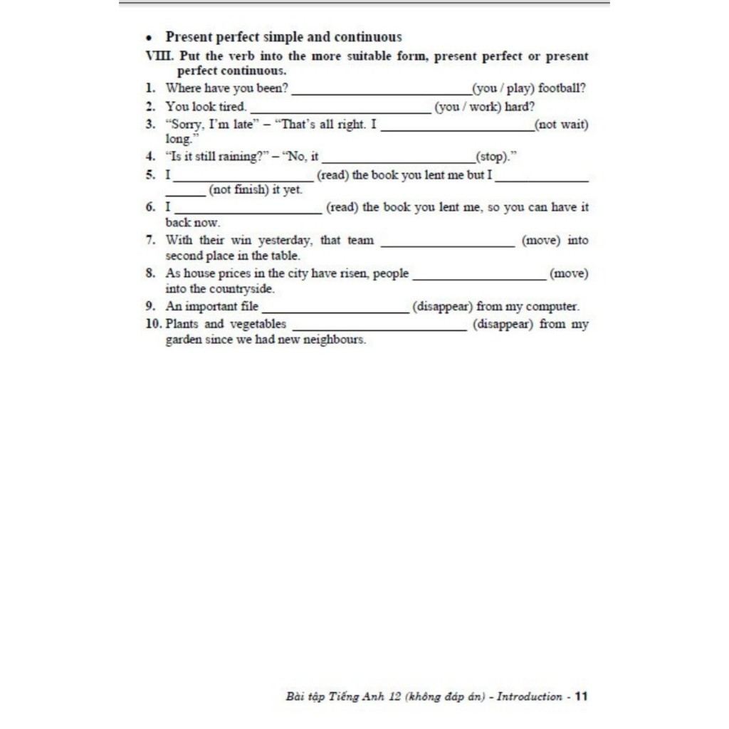 Giáo dục phổ thông: Chương trình môn Tiếng Anh theo Thông tư số 32/2008/TT-BGDĐT ngày 26 tháng 12 năm 2018, và Chương trình lớp 12 mới được giảng dạy đại trà ở các trường phổ thông từ năm học 2024 – 2025. Bài tập Tiếng Anh 12 – Không đáp án gồm một bài ôn tập củng cố kiến thức đã học (Introduction), và 8 đơn vị bài học chính: Relationships; Problems; Customs and culture; Holidays and tourism; Careers; Health; Media; Change the world. Sau mỗi đơn vị bài học đều có bài ôn tập Review.