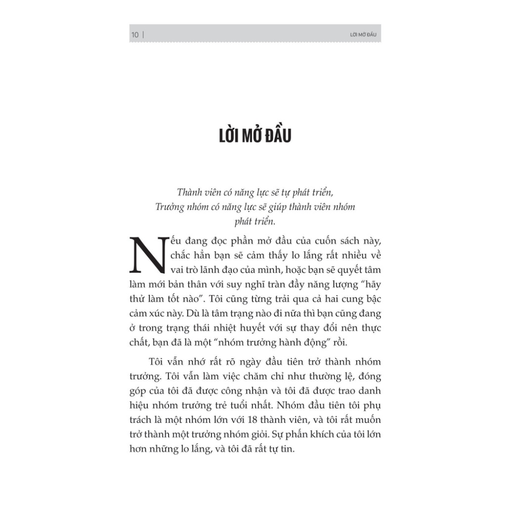 Cuốn sách mang tới những kiến thức để những trưởng nhóm thúc đẩy và phát triển các thành viên trong nhóm, xây dựng thái độ và phương pháp quản lý tổ chức cần được trang bị khi trở thành trưởng nhóm. Ngoài ra, cuốn sách còn cung cấp những mẫu cần thiết cho từng quy trình làm việc. Các phương pháp này được tác giả rút ra từ kinh nghiệm thực tiễn khi áp dụng tại đa dạng các mô hình công ty, từ các công ty lớn, đến các công ty toàn cầu, các doanh nghiệp vừa và nhỏ. Chỉ cần vận dụng những phương pháp này, những khó khăn khi làm trưởng nhóm không còn là nỗi lo.