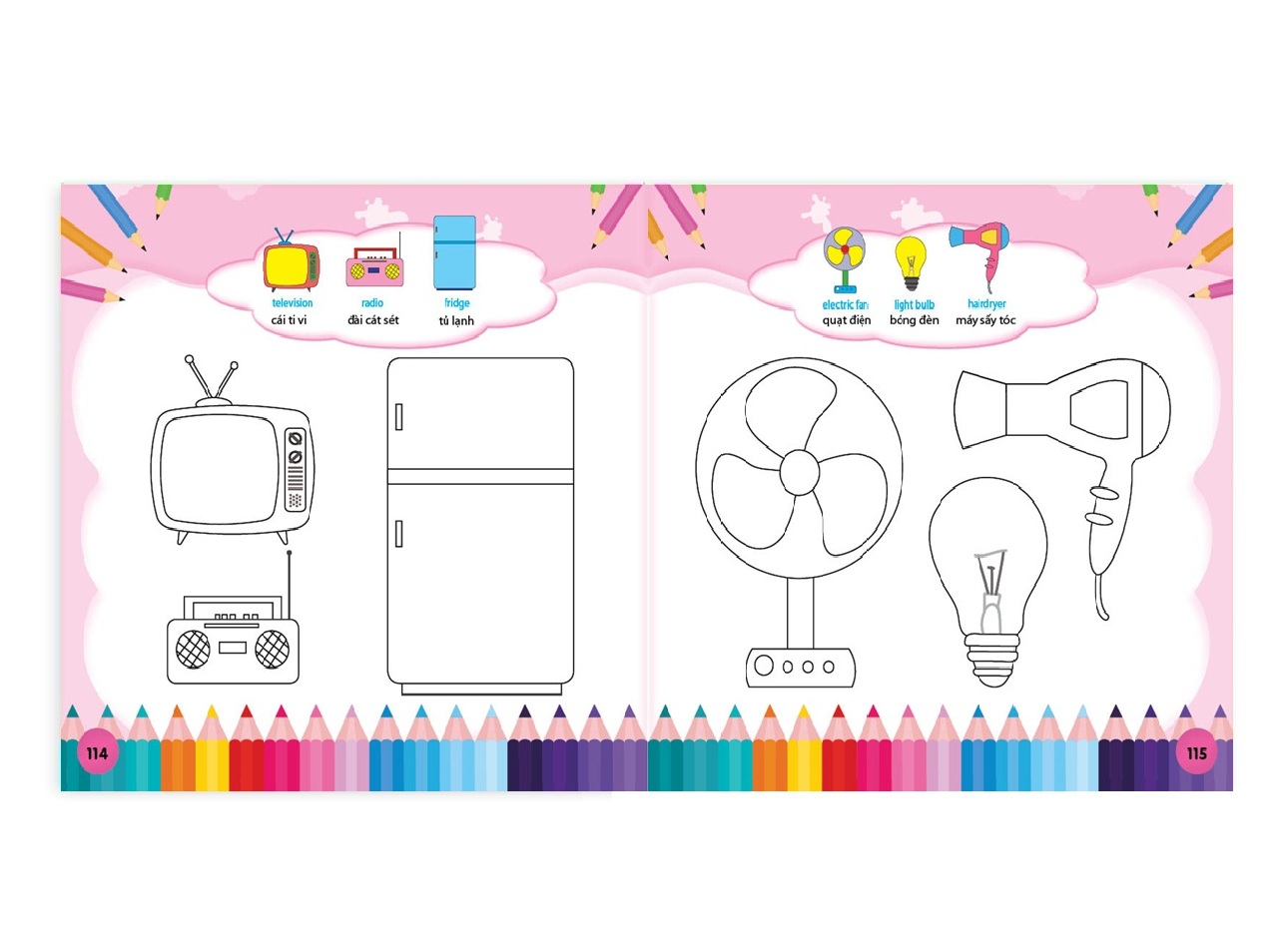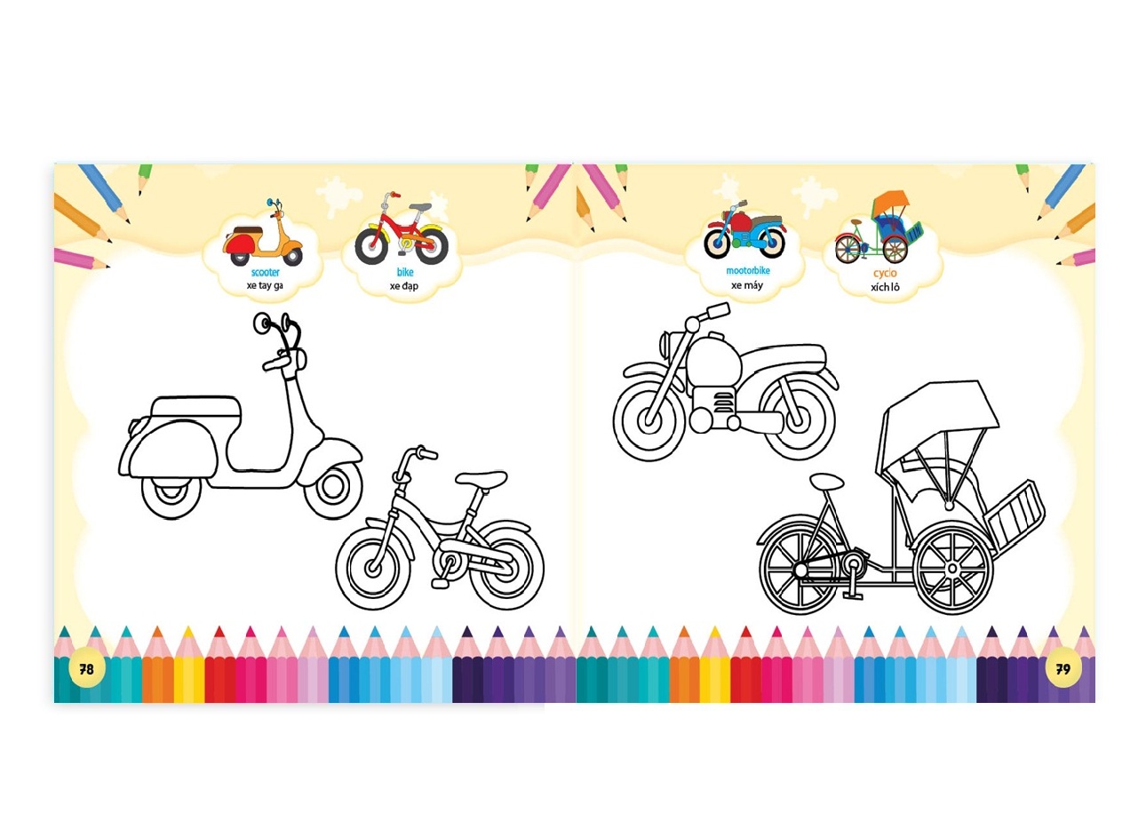 - Cuốn sách tô màu với nhiều hình vẽ chủ đề khác nhau, gần gũi với cuộc sống xung quanh bé. Bé có thể thỏa sức phối màu sắc tạo những bức tranh sinh động