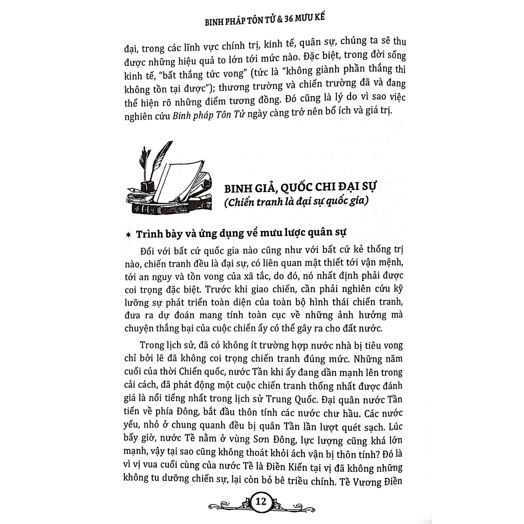 Binh Pháp Tôn Tử & 36 Mưu Kế Ba mươi sáu kế (Tam thập lục kế hay Tam thập lục sách) là một bộ sách tập hợp 36 sách lược quân sự của Trung Quốc cổ đại, ba mươi sáu kế bắt đầu xuất hiện từ thời Nam Bắc triều và tới thời nhà Minh thì được tập hợp thành sách. Tôn Tử binh pháp là gì? Đó chính là cuốn binh thư cổ có giá trị nhất của Trung Quốc, còn được gọi là Binh pháp Ngô Tôn Tử. Sách gồm 13 thiên: Kế thiên, Tác chiến, Mưu công, Hình thiên, Thế thiên, Hư thực, Quân tranh, Cửu biến, Hành quân, Địa hình, Cửu thiên địa, Hỏa công và Dụng gián, được viết bằng cổ văn tiền Tần, với hơn 5.900 chữ Hán. Tam thập lục kế (36 kế) được thấy sớm nhất trong các câu chuyện thời Xuân Thu - Chiến Quốc. Về sau, nhiều đời, nhiều người đã ghi chép, hiệu đính lại cuốn sách đó. Có thể nói, hai cuốn sách này đã tập hợp lại