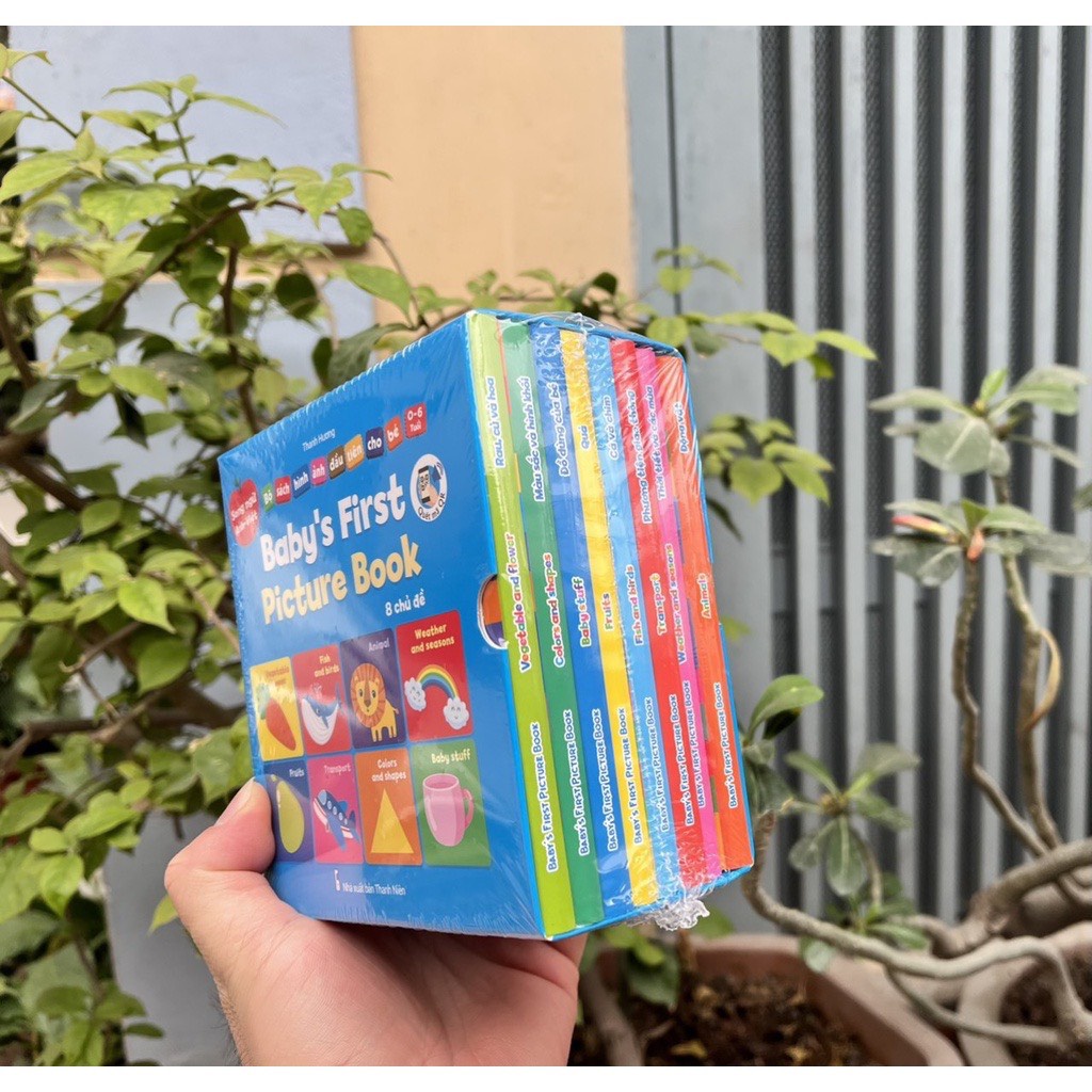 BỘ SÁCH BÌA CỨNG THƯ VIỆN HÌNH ẢNH ĐẦU TIÊN CHO BÉ VỀ Thế Giới Xung Quanh BABY’S FIRST PICTURE BOOK dành cho bé từ 0-6 tuổi (8 chủ đề) song ngữ Anh - Việt có phiên âm. (Quét mã QR file nghe với giọng đọc tiếng Anh chuẩn bản ngữ) Đây là món quà nhỏ tuyệt vời nhất mà cha mẹ nên dành tặng cho bé yêu khám phá thế giới xung quanh. Bộ sách được thiết kế 100% bìa cứng, bo tròn góc, cán bóng bề mặt cả bìa và trang sách. Rất bền và an toàn cho các bé khi sử dụng, không lo rách sách, không thấm nước và có thể lau sạch khi trẻ bôi bẩn. Sách khổ vuông 12,5 x12,5 cm, vừa tay bé cầm, bé có thể mang đi bất cứ đâu. Mỗi quyển 16 trang. Hình ảnh minh họa đẹp, màu sắc sống động, thu hút trẻ, nội dung được biên soạn song ngữ Anh – Việt có phiên âm. Trọn bộ 8 quyển gồm các chủ đề: