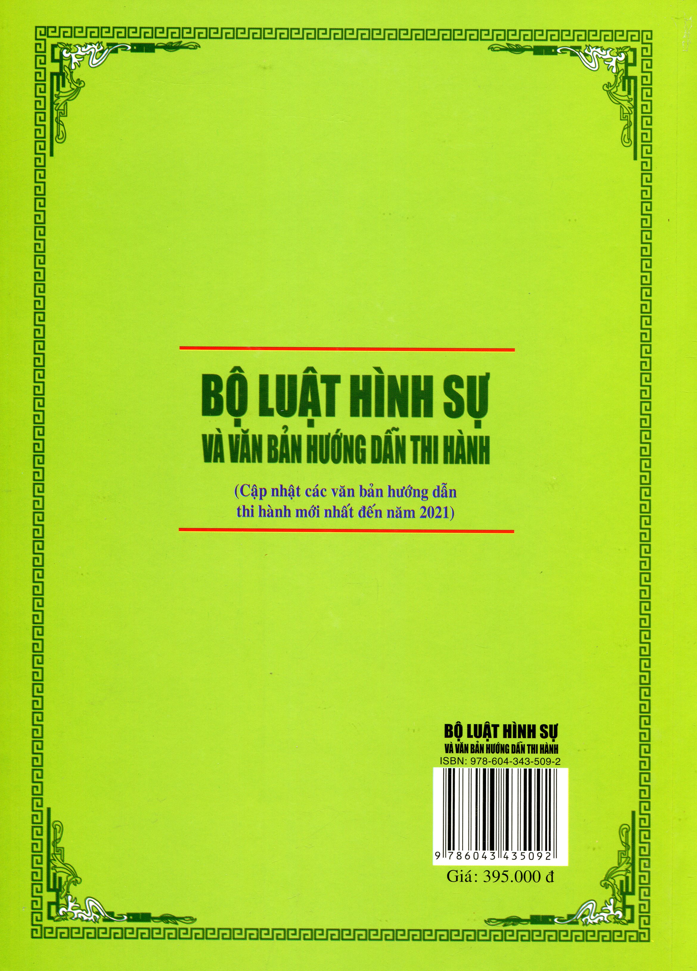 Từ ngày 1/1/2018, Bộ luật Hình sự năm 2015 chính thức có hiệu lực thi hành. Để Bộ luật Hình sự di vào cuộc sống, góp phần nâng cao ý thức pháp luật của người dân, tạo điều kiện cho việc nhận thức thống nhất trong áp dụng để giải quyết vụ án hình sự, nhiều văn bản hưởng dẫn thi hành Bộ luật Hình sự đã được ban hành như: Nghị quyết số 08/2021/NQ-UBTVQH15 ngày 26/11/2021 Giải thích Khoản 1 Điều 289 của Bộ luật Hình sự. Công văn số 1557/VKSTC-V1 ngày 20/04/2021 Về việc Hướng dẫn nghiệp vụ áp dụng các Điều 347 348 và 349 Bộ luật Hình sự. Nghị quyết số 03/2020 NQ-HĐTP ngày 30/12/2020 Hướng dẫn áp dụng một số quy định của Bộ luật Hình sự trong xét xử tội phạm tham nhũng và tội phạm khác về chức vụ Để kịp thời tuyên truyền, phổ biến những chủ trương, chính sách cùng những quy định pháp luật mới nhất về hình sự, Nhà xuất bản Lao Động cho xuất bản cuốn sách:
