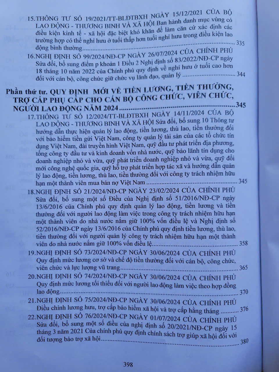 Thời gian gần đây, Chính phủ và các Bộ ngành đã ban hành nhiều văn bản pháp quy liên quan đến lĩnh vực lao động, trợ cấp, tiền lương như: Nghị định 73/2024/NĐ-CP ngày 30/06/2024 Quy định mức lương cơ sở và chế độ tiền thưởng đối với cán bộ, công chức, viên chức và lực lượng vũ trang, Nghị định 74/2024/NĐ-CP ngày 30/06/2024 Quy định mức lương tối thiểu đối với người lao động làm việc theo hợp đồng lao động, Nghị định 75/2024/NĐ-CP ngày 30/06/2024 Điều chỉnh lương hưu, trợ cấp bảo hiểm xã hội và trợ cấp hằng tháng…