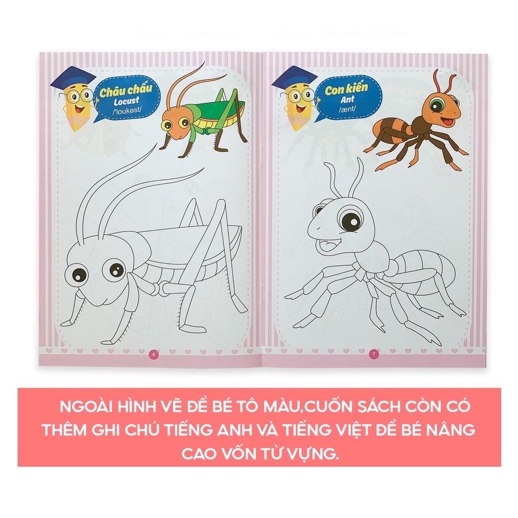 ❖ Ngoài hình vẽ để bé tô màu,cuốn sách còn có thêm ghi chú tiếng anh và tiếng việt để bé nâng cao vốn từ vựng