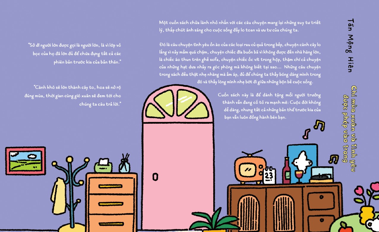 Đó là câu chuyện tình yêu ồn ào của các loại rau củ quả trong bếp, chuyện cành cây lo lắng vì nảy mầm quá chậm, chuyện chiếc đĩa buồn bã vì không được đến nhà hàng lớn, là chiếc áo thun trên ghế sofa, chuyện chiếc ốc vít trong hộp, thậm chí cả chuyện của những hạt dưa nhảy ra góc phòng mà không biết tại sao... Những câu chuyện trong sách đều thật nhẹ nhàng mà ấm áp, đủ để chúng ta thấy bóng dáng mình trong đó và thấy lòng mình nhẹ bớt đi giữa những bộn bề cuộc sống.