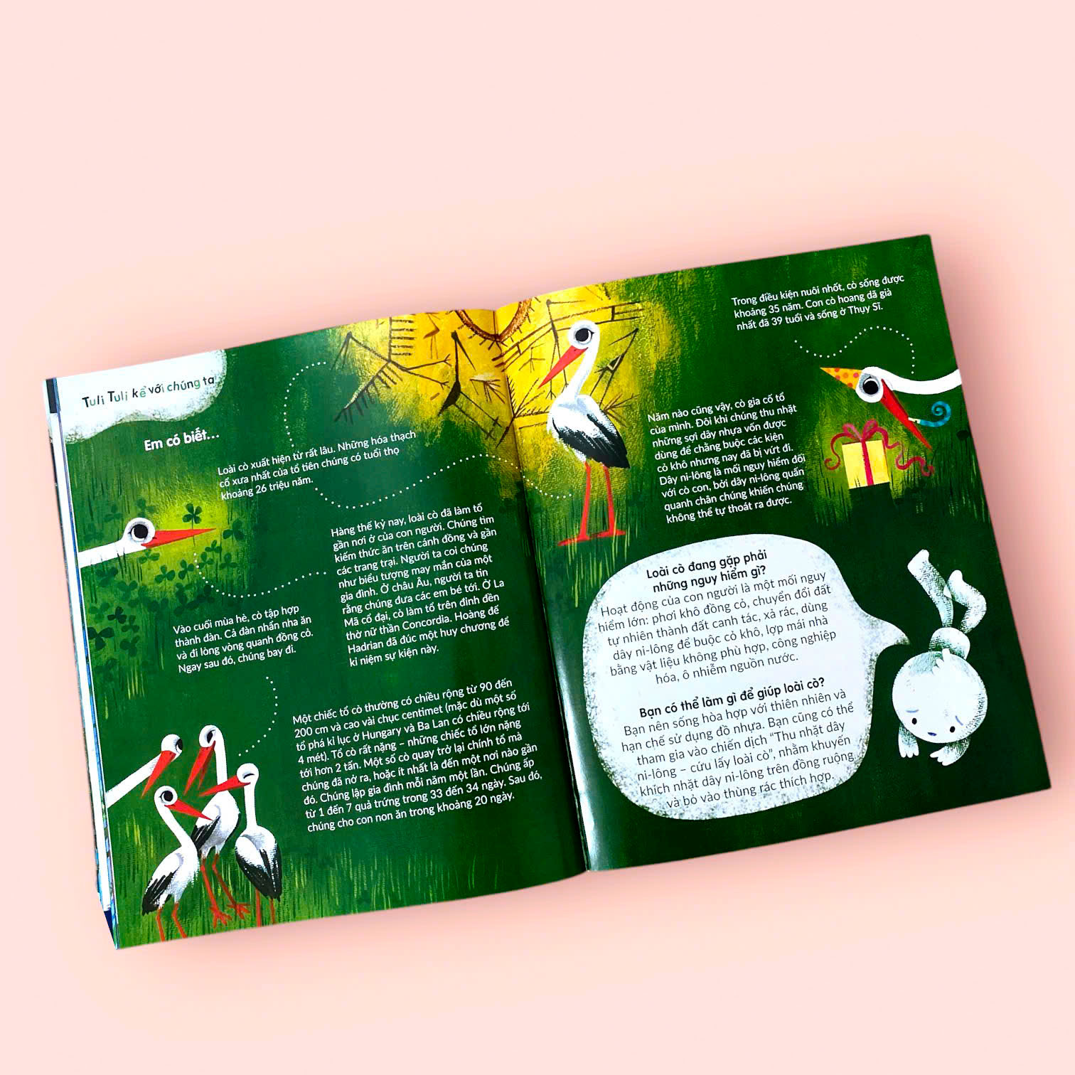 NHÀ CHIM TRÊN ĐỒNG CỎ Nhà Chim Trên Đồng Cỏ dẫn dắt bạn nhỏ khám phá chiếc tổ lơ lửng trên ngọn cột điện của gia đình cò Bolek - nơi có tầm nhìn bao quát đồng cỏ rộng lớn với vô số loài cỏ, hoa dại và các loài động vật khác sinh sống.   Nhân vật chính của câu chuyện là Kuba, chú cò con lớn nhất trong gia đình Bolek. Cùng theo chân Kuba trong hành trình trưởng thành đầy thú vị, các bạn nhỏ sẽ được chứng kiến sự xuất hiện của những chú cò bên trong quả trứng, những bước đi chập chững đầu tiên, hay khi chúng học bay, học bắt mồi, học cách giao tiếp với thế giới xung quanh và khám phá vô vàn điều mới mẻ. Cuốn sách quý giá này còn giúp các bạn nhỏ tìm hiểu về loài cò như: Cò làm tổ ở đâu? Chúng sinh sản như thế nào? Cò ăn gì và chúng bắt mồi thế nào? Ngoài cò những loài chim nào thích sống theo đàn? Loại chim nào sinh sống trên đồng cỏ?...   “Nhà Chim Trên Đồng Cỏ” là món quà tuyệt vời dành cho các bé yêu thích khám phá thế giới tự nhiên, đặc biệt là những bé yêu thích các loài chim. Sách không chỉ giúp bé học hỏi kiến thức mới về loài cò và môi trường sống của chúng mà còn khơi gợi niềm đam mê tìm hiểu về khoa học và bảo vệ môi trường.