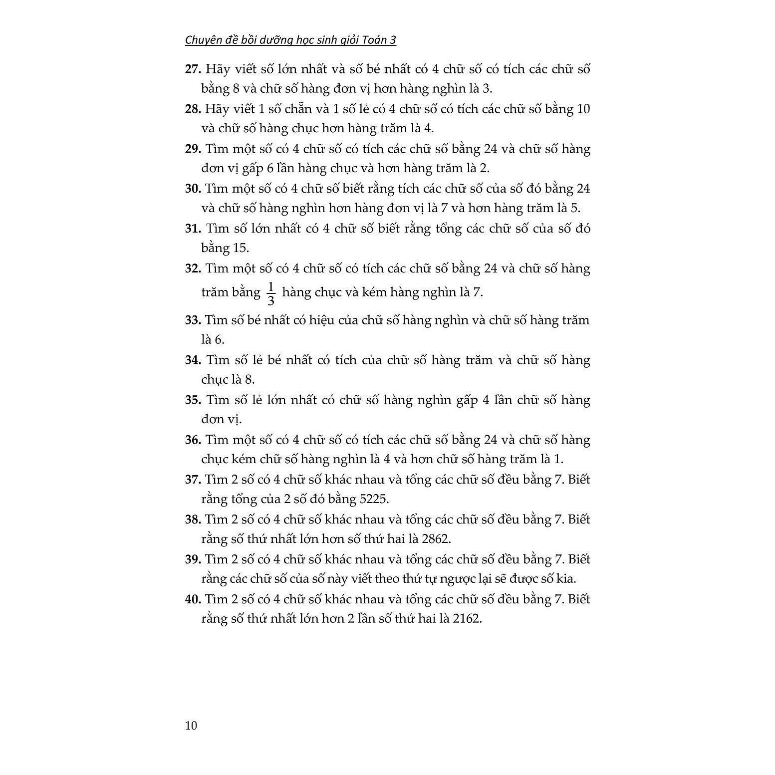 Cuốn Chuyên Đề Bồi Dưỡng Học Sinh Giỏi Toán 3 nhằm giúp học sinh lớp 3 phát triển và nâng cao kiến thức môn toán.Cuốn sách là Cuốn “Chuyên đề bồi dưỡng học sinh giỏi Toán 3” một tài liệu tham khảo cho giáo viên cũng như các bậc phụ huynh trong quá trình hướng dẫn học sinh làm thêm các bài tập trong mỗi tuần. Cuốn sách được biên soạn theo nội dung chương trình sách giáo khoa Toán 3 - CTGDPH 2018 có thể dùng chung cho tất cả các bộ sách hiện hành. Với các chủ đề khác nhau , mỗi năm gồm nhiều chuyên đề, mỗi tuần một chuyên đề giúp học sinh ôn luyện, củng cố và khắc sâu kiến thức cơ bản.